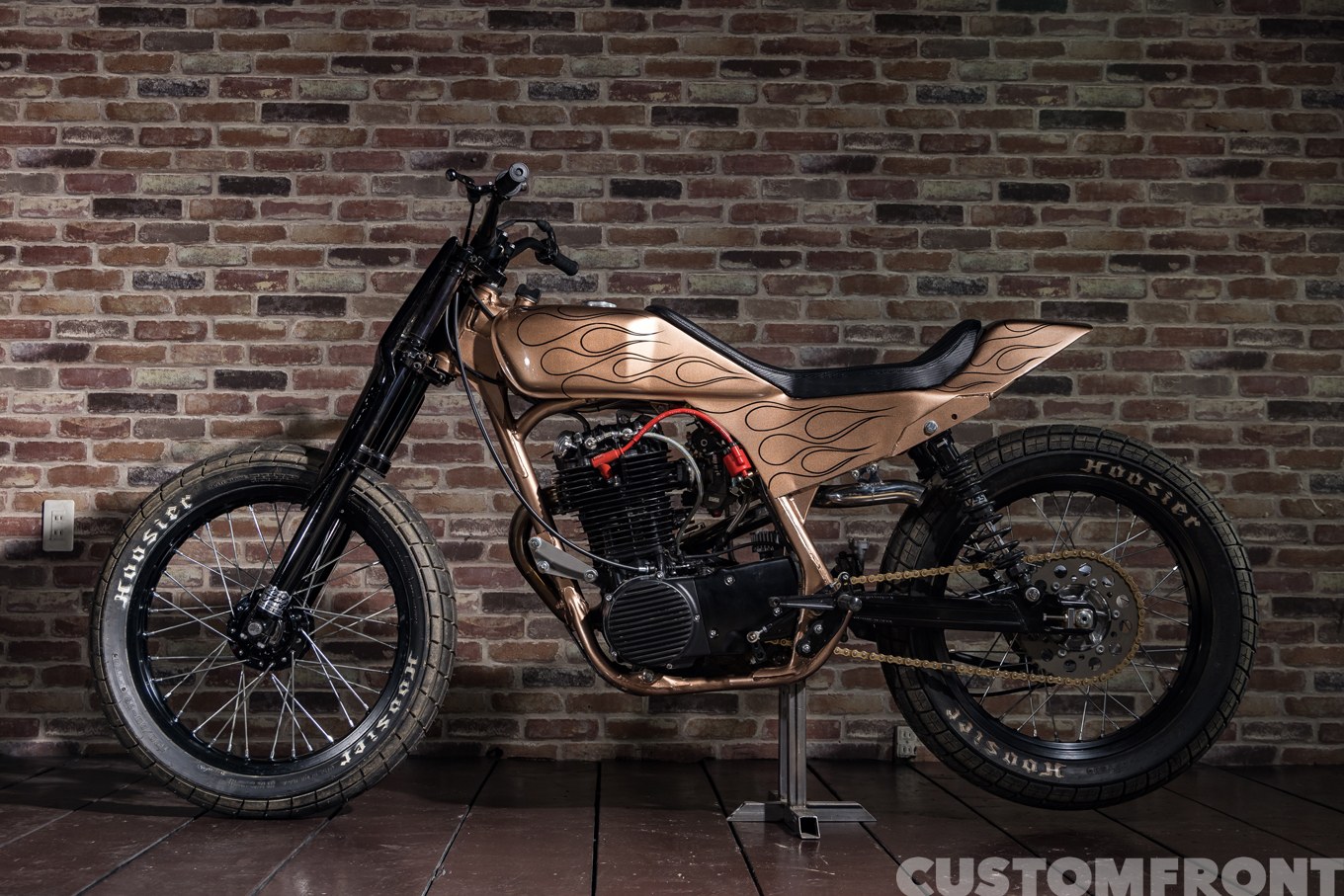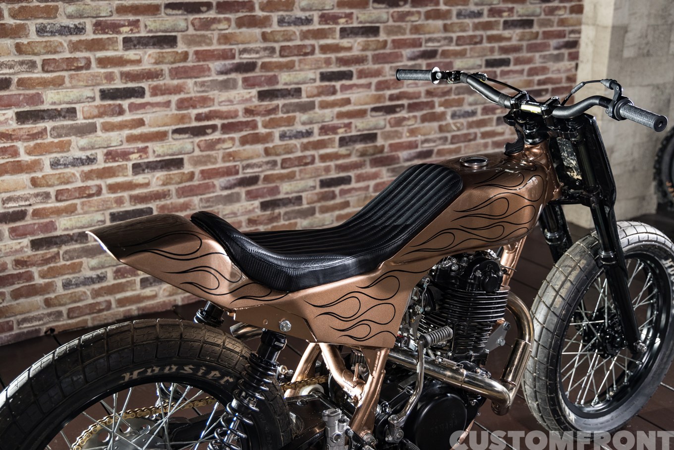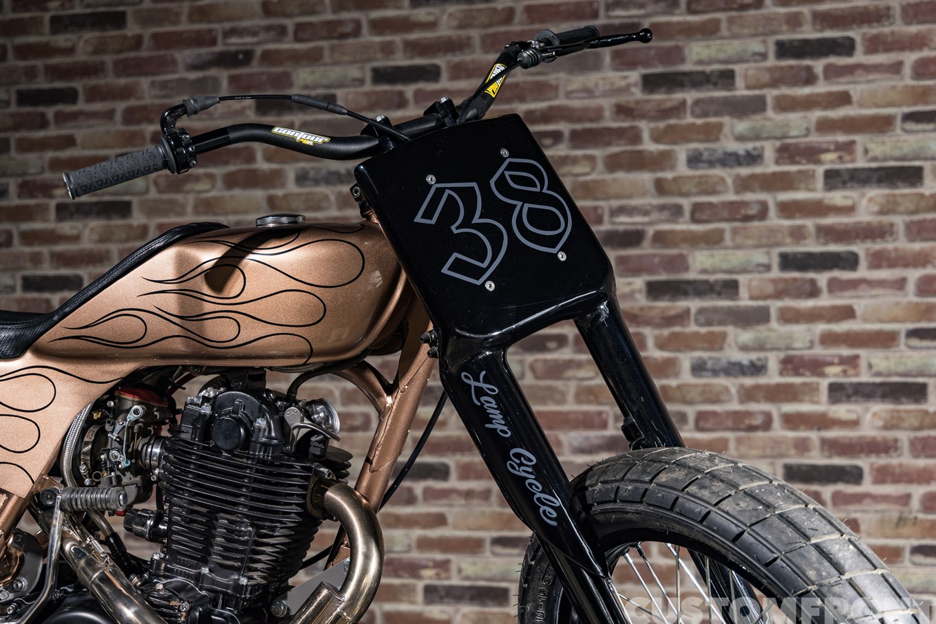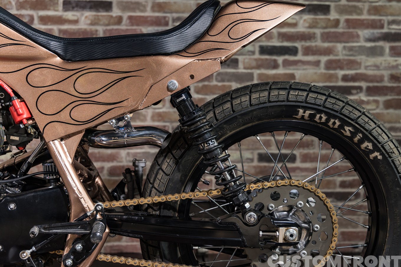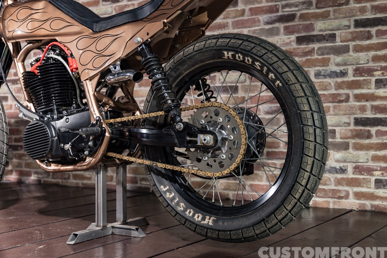 ホイールサイズは当然の如く、フラットトラック定番の前後19インチに設定。レタリングが好きだというフージャーのフラットトラックタイヤを今回も選んだ。
