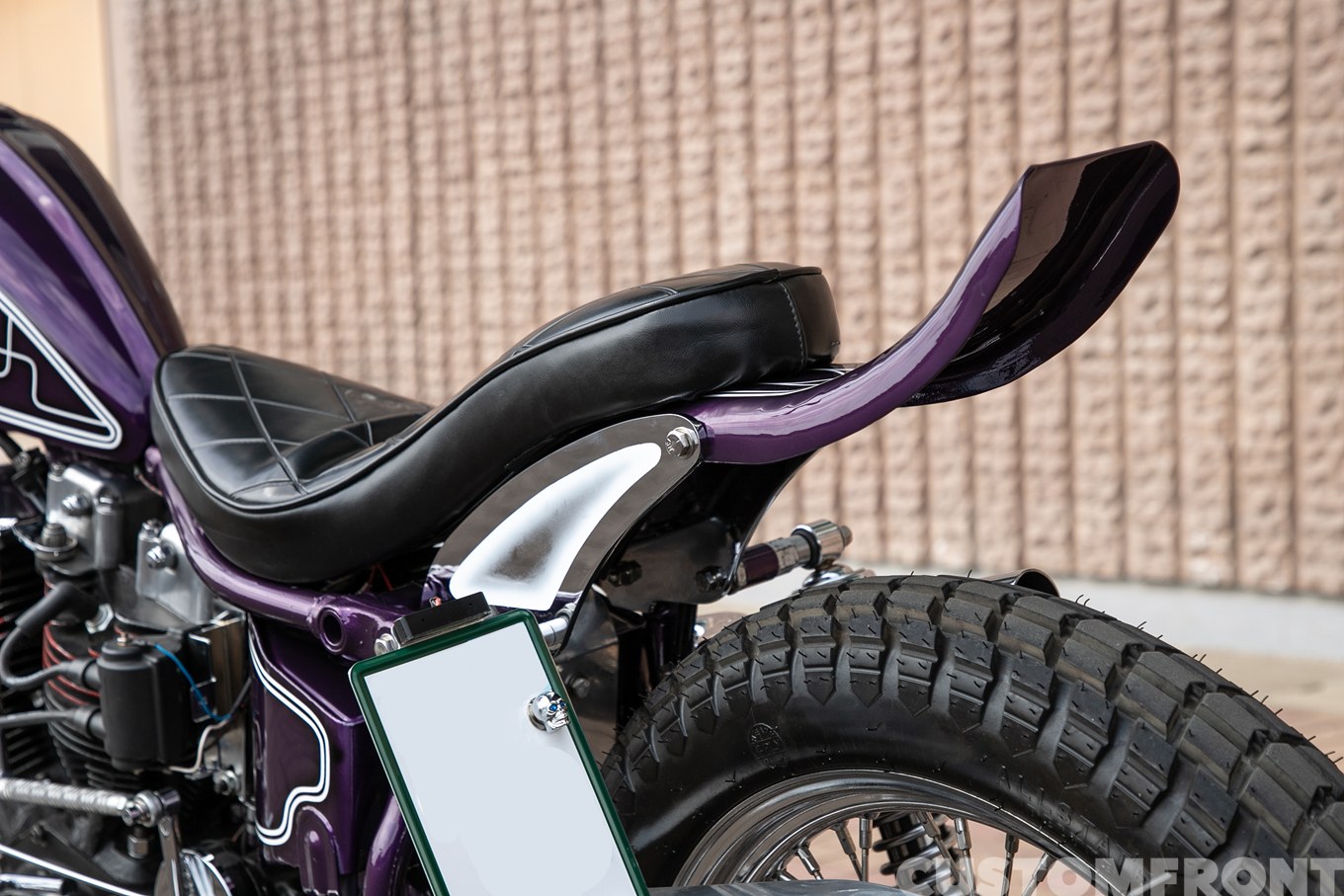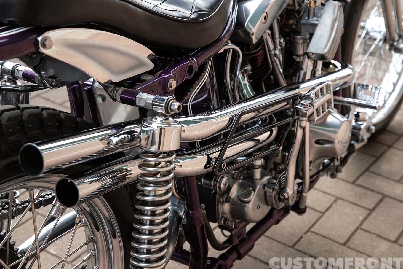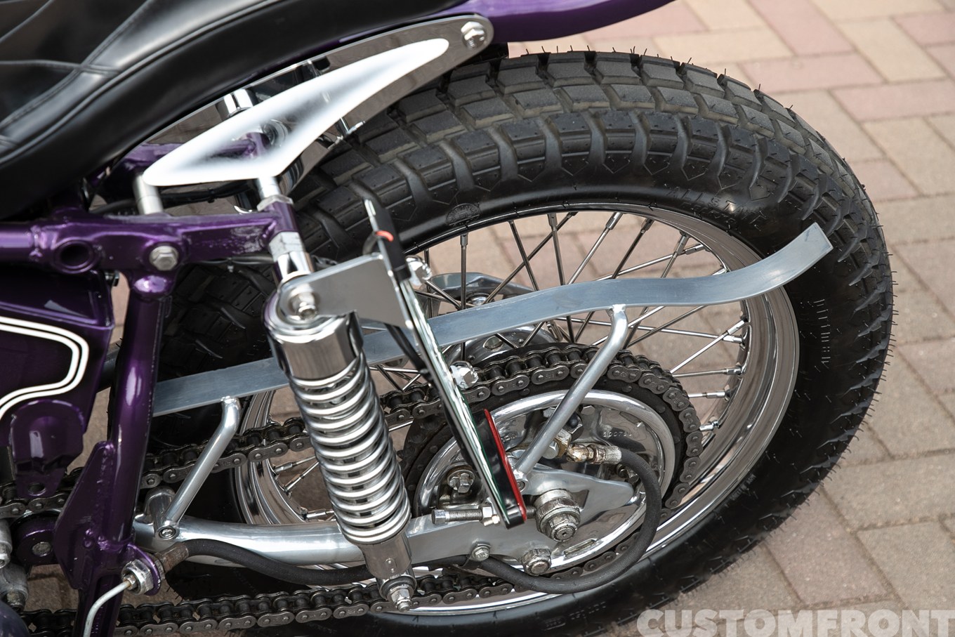 5インチフェンダーを使い跳ね上げテールに。ストラットに6mm厚の鉄板を用いて、メッキ後にエアブラシを。