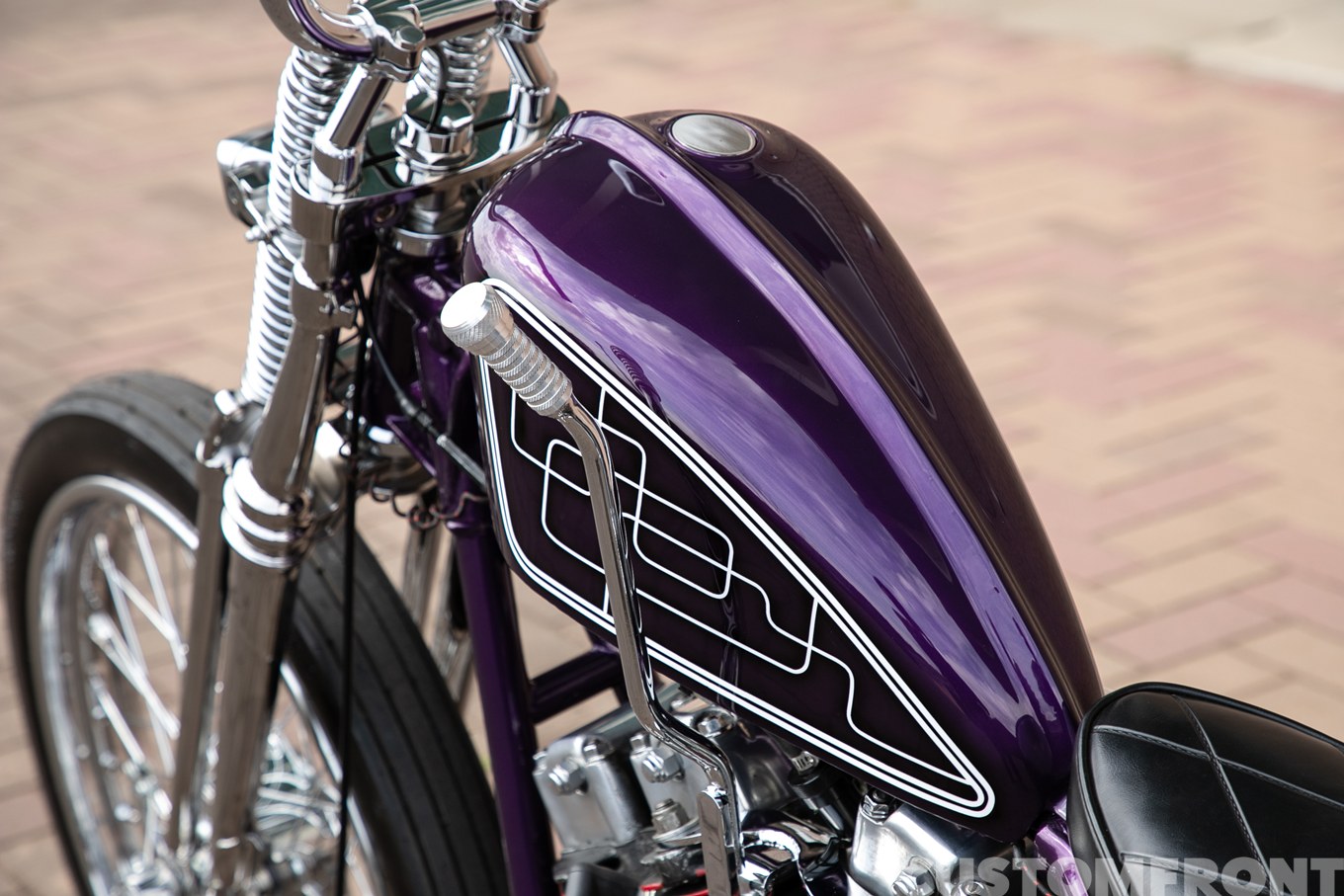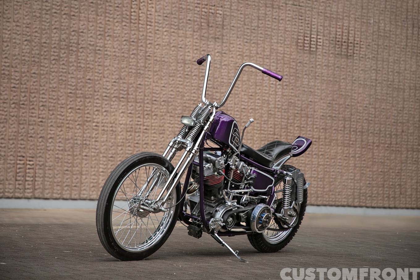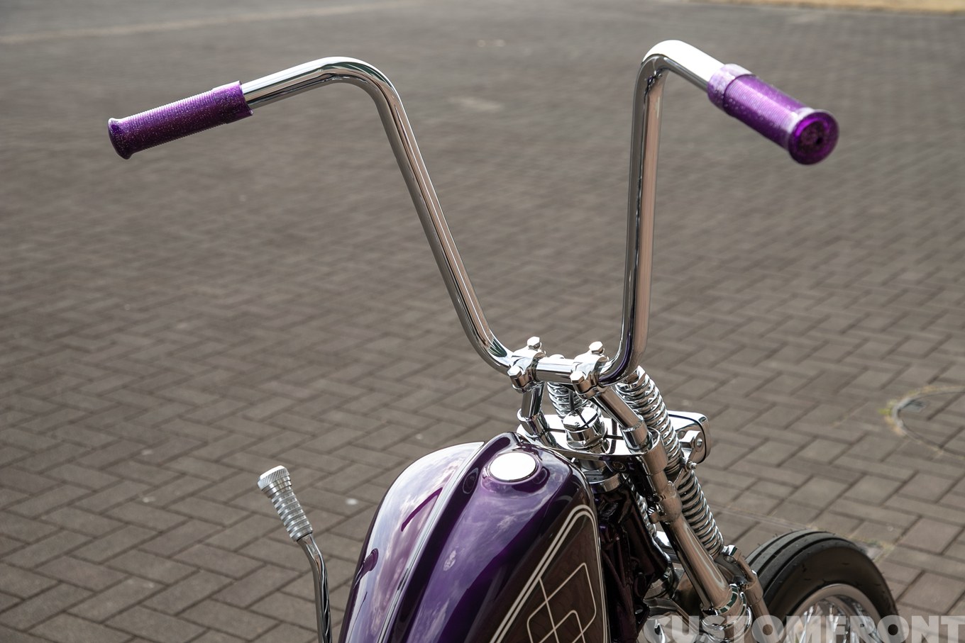 今回は骨格に、リジッドフレームではなく4速フレームを選出。そこに2インチオーバーのナロースプリンガーを合わせ、エイプハンガーはインナースロットル化され配線類はすべてパイプ内へ隠伏。左右レバーレスとすることでハンドルはクリーンに演出された。