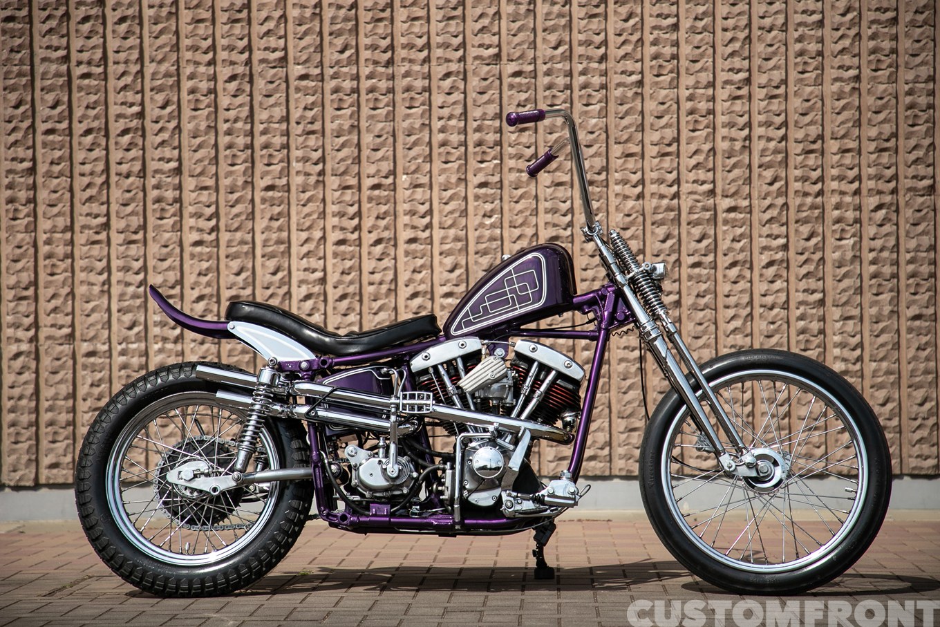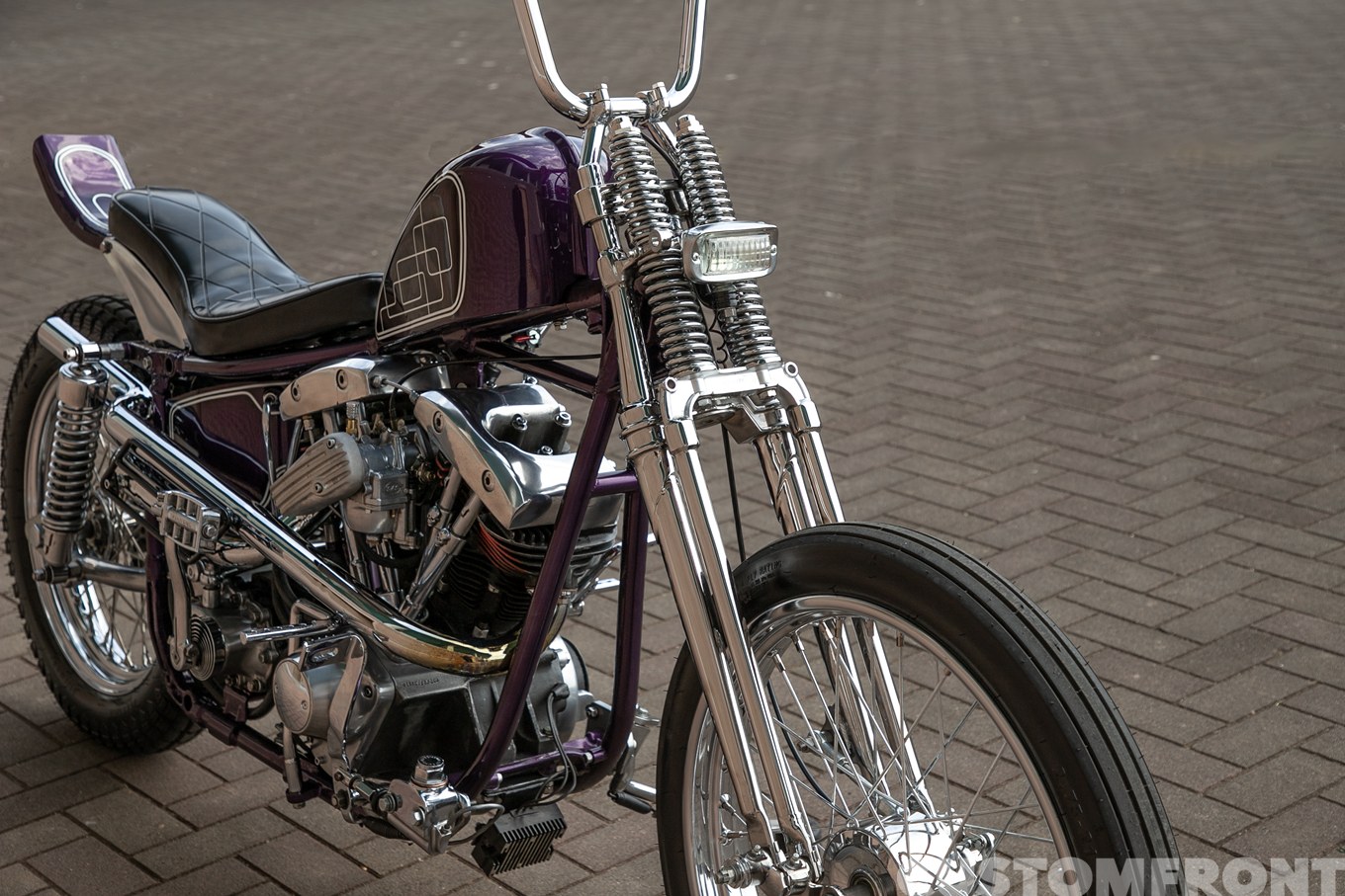 フォークは74タイプのナロースプリンガーの2インチオーバーを装着。ヘッドライトはスクエアタイプを選択。