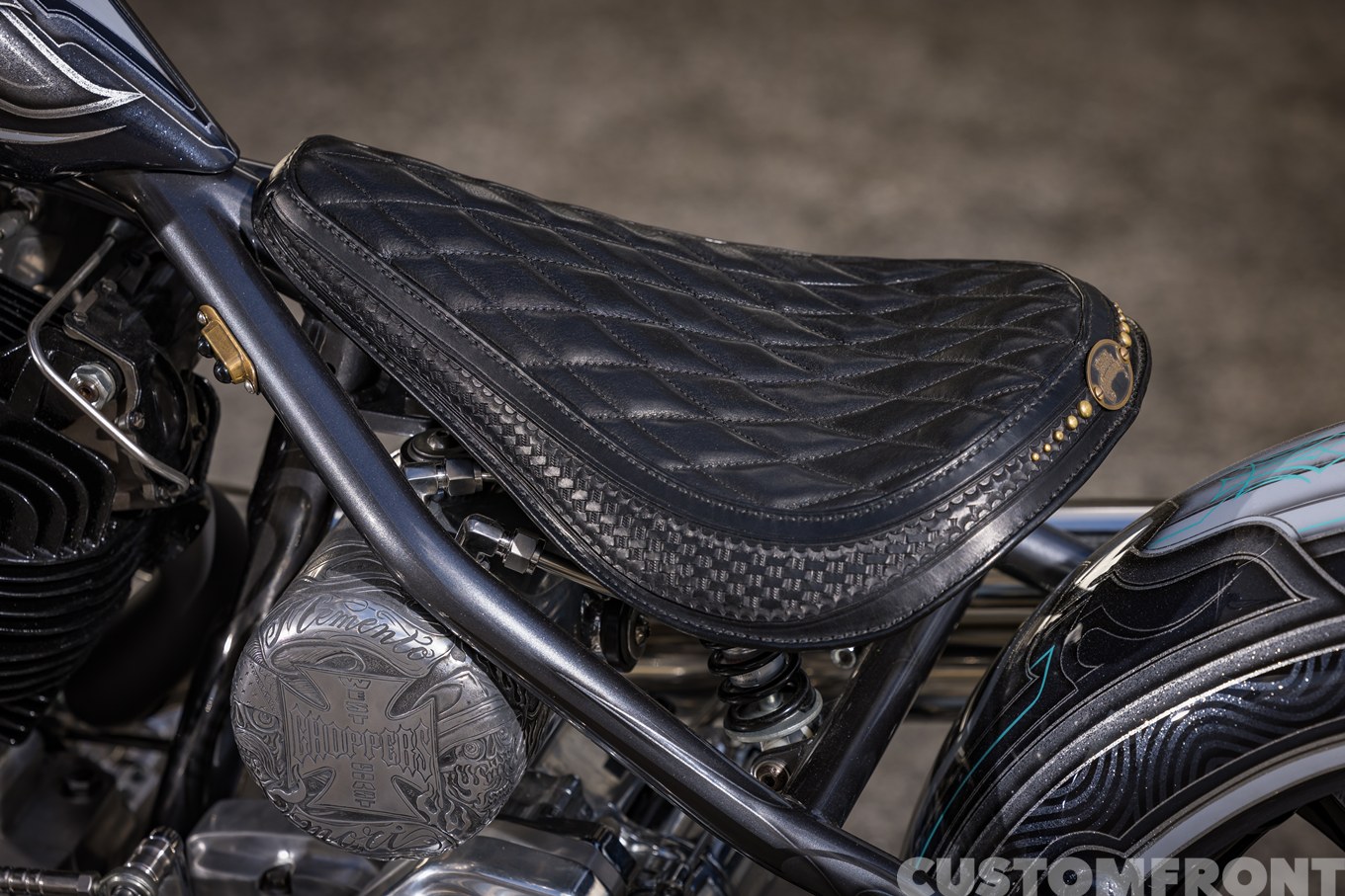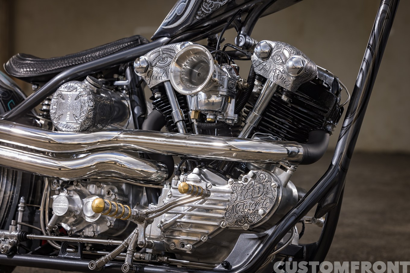エンジン周りに施されたエングレービングもまた、ミューラルと同じくローライダーの技法のひとつ。陰と陽を表現したというその彫金は、ミューラルと相まってマシンにローライダーのエッセンスを加え、ワン&オンリーなマシンをさらに無二の存在へと高めている。
