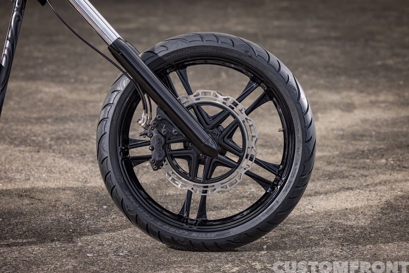 スムースなボトムのHHI製8インチオーバーのフォークにRYDのホイール&ローター、ブレーキはブレンボ製。