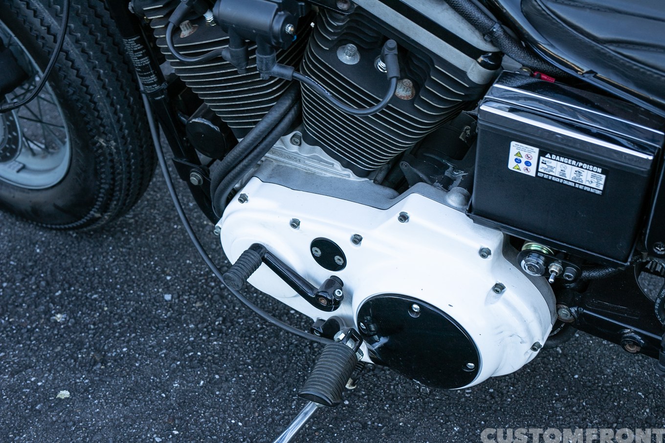 左足の定位置となるプライマリーカバーは白く塗装。左フロントフォークのカバーも同様の白に塗装された。