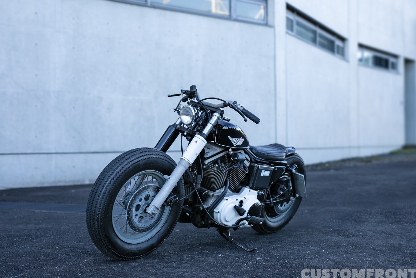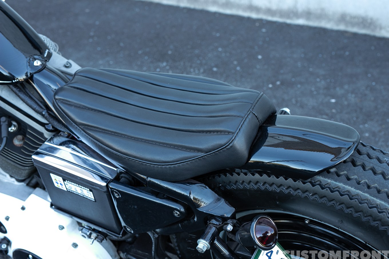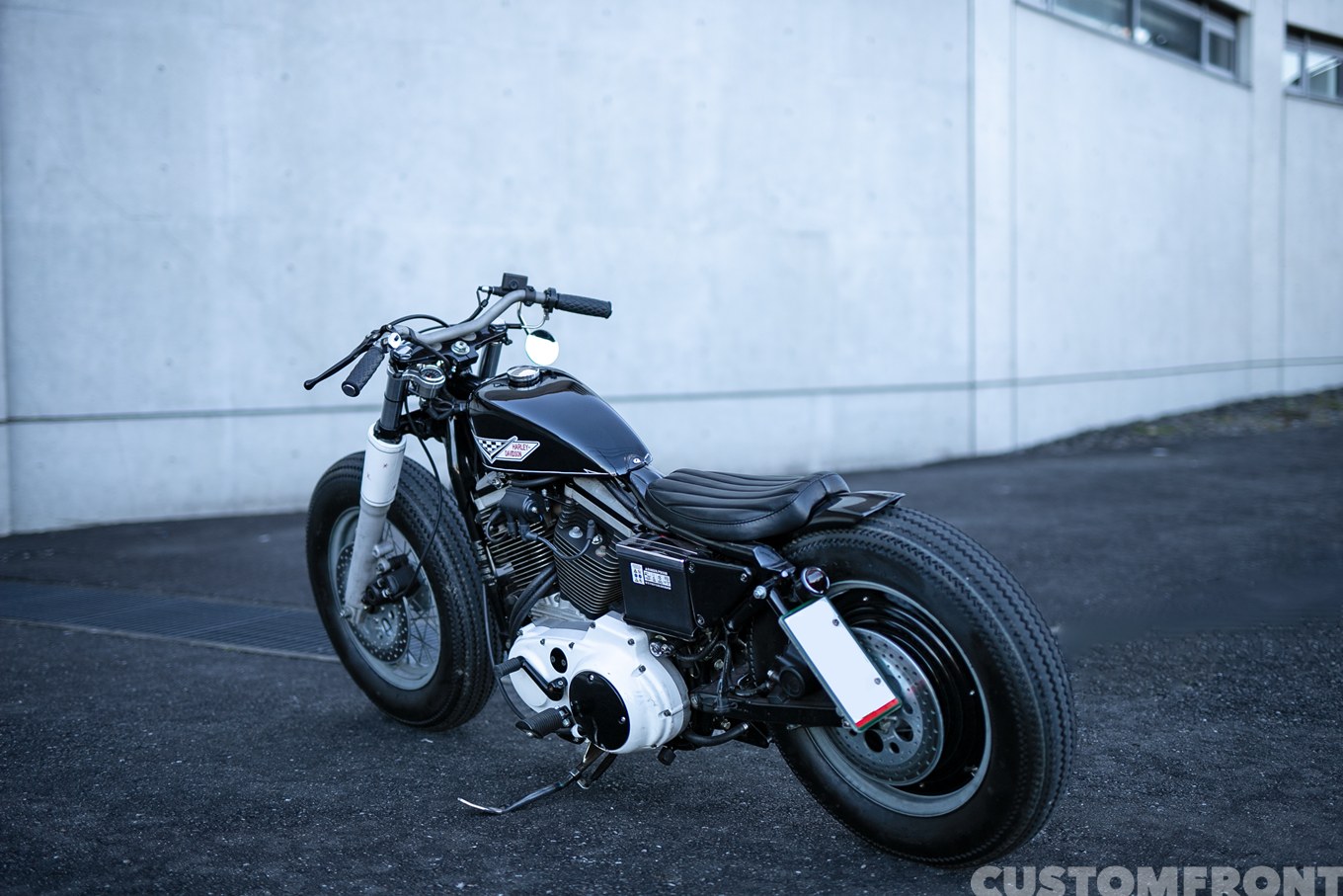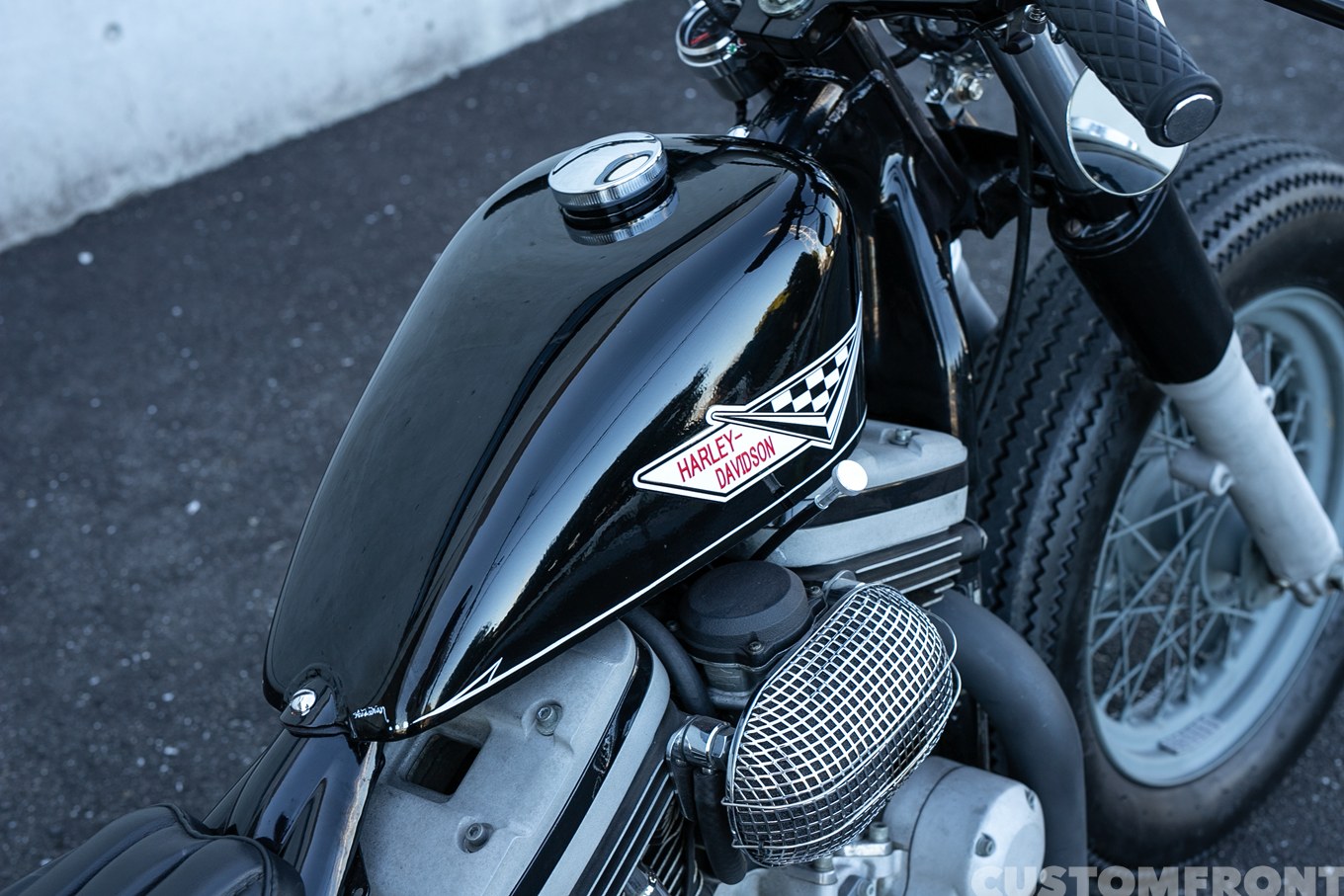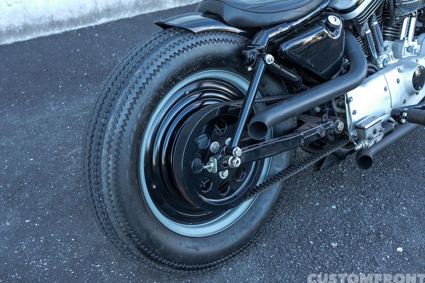 ソフテイルのフロントフォーク、リアはリジット化。前後タイヤは16インチで、フロントはFLのワイドリム、リアはスポーツ純正リムを使用。ガスタンクは汎用のスポタンをワンオフ。西山さんが持つあらゆる技巧を詰め込み、そしてひた隠し、1台のストリートスターが完成した。