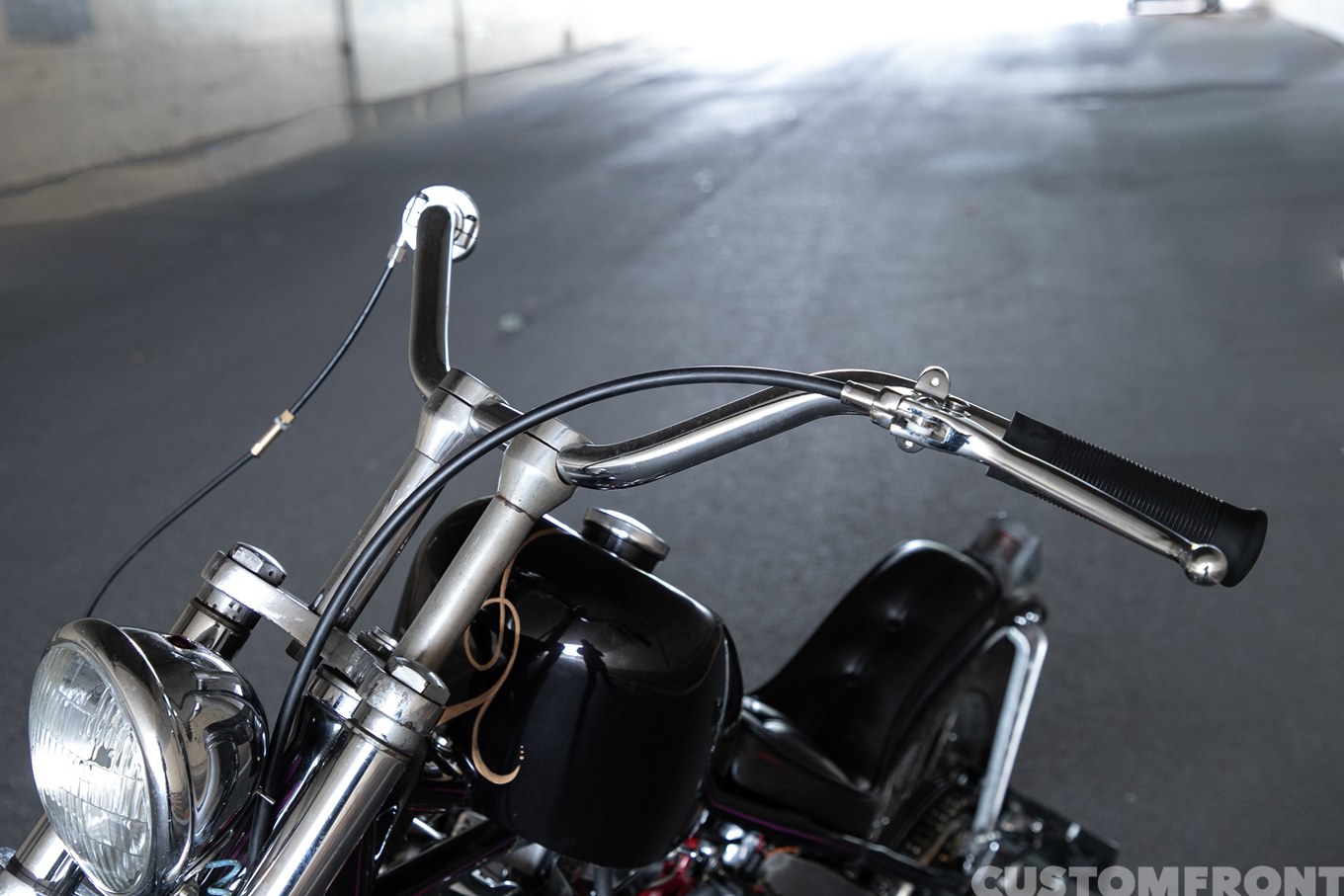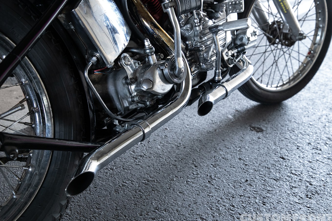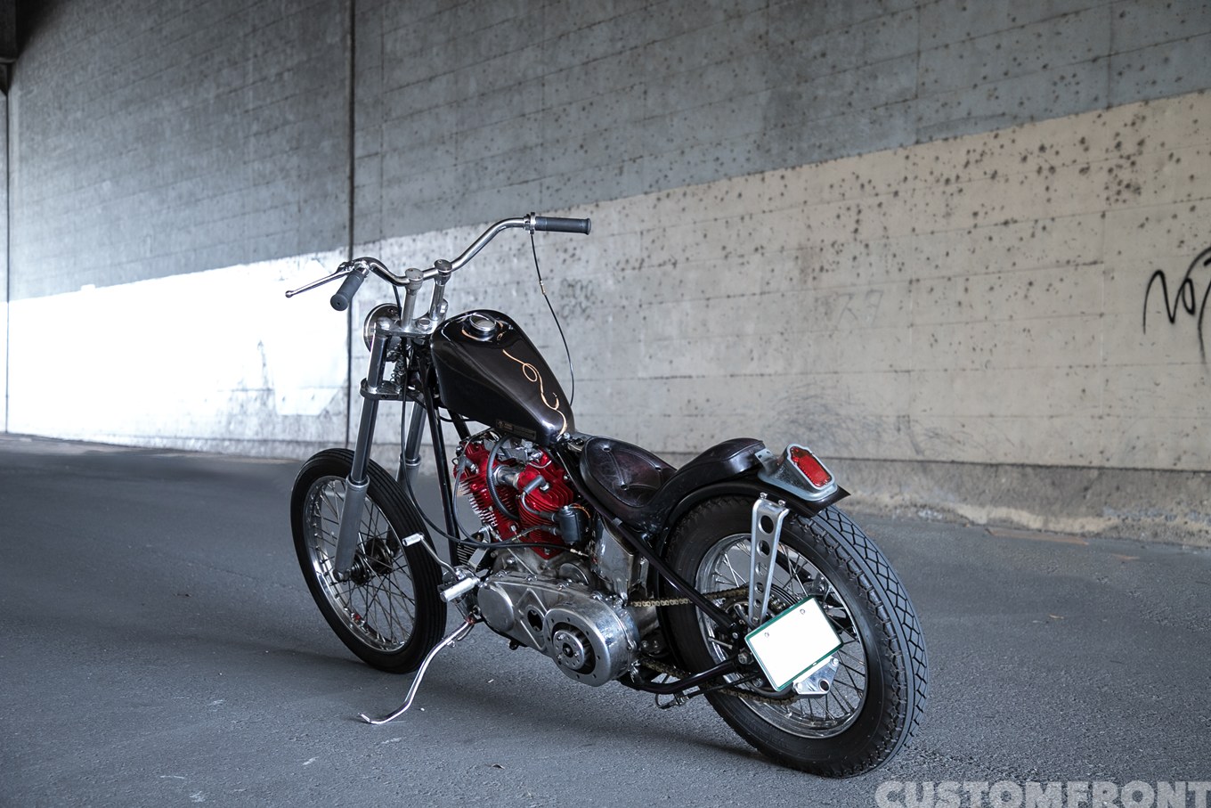 飾らない言動がいなせだ。フロント周りはバーニーズ製ステムに、8インチオーバーの41φナローフォークを装着。次いで前後21/18インチホイールやライザーはどこかのヴィンテージの名品を使うが、氏にとってそれがいくらでどこ製かは特別重要ではない。判断基準はカッコいいかどうか、ただそれだけ。