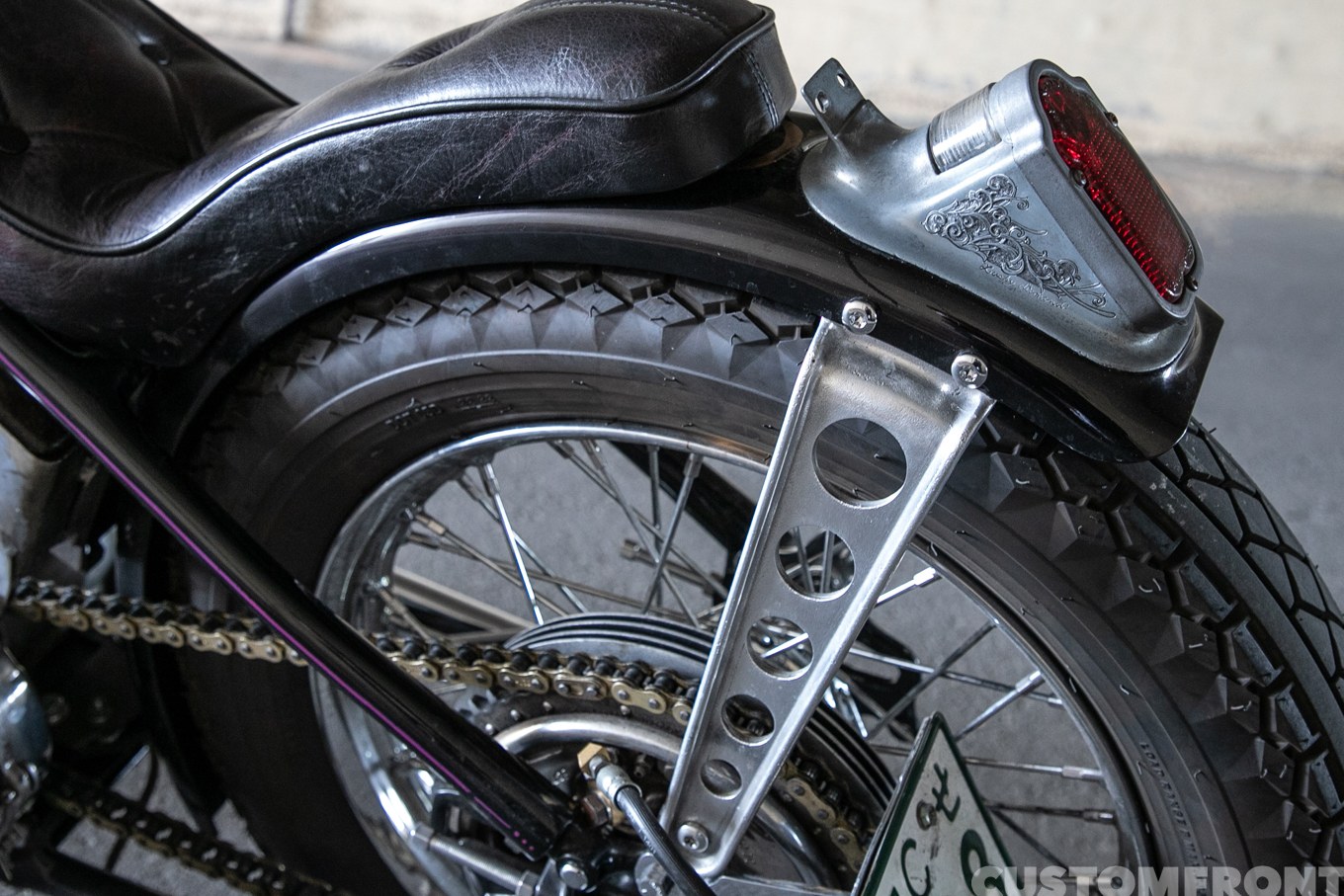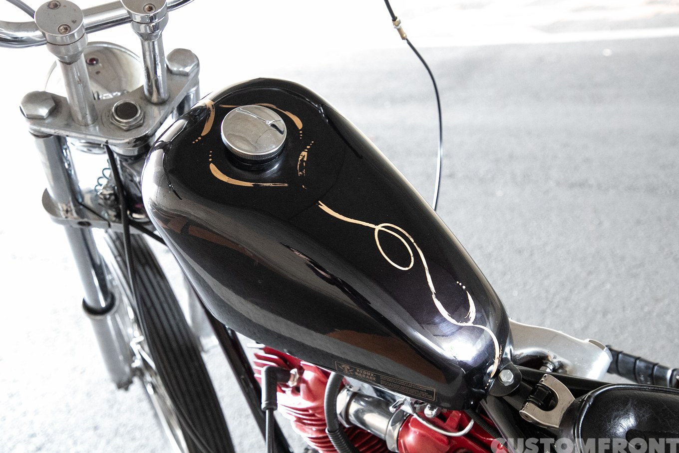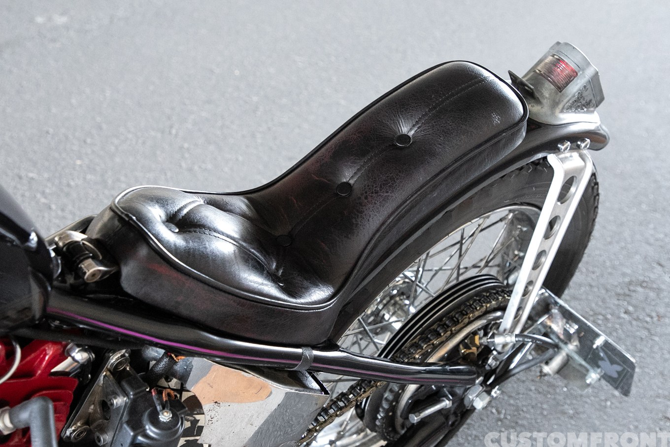 今回リアフェンダーのステーはインドネシアの友人KEDUXからもらったもので、その使用は最初から決めていたことだと言う。そこで、だったら他の部分も好きな人にお願いしたいと、塗装は新潟のライズに任せ、ピンストはHoodoo Man、シートはダルマに依頼。同じ度数で酩酊できるとびっきりで脇は固められた。