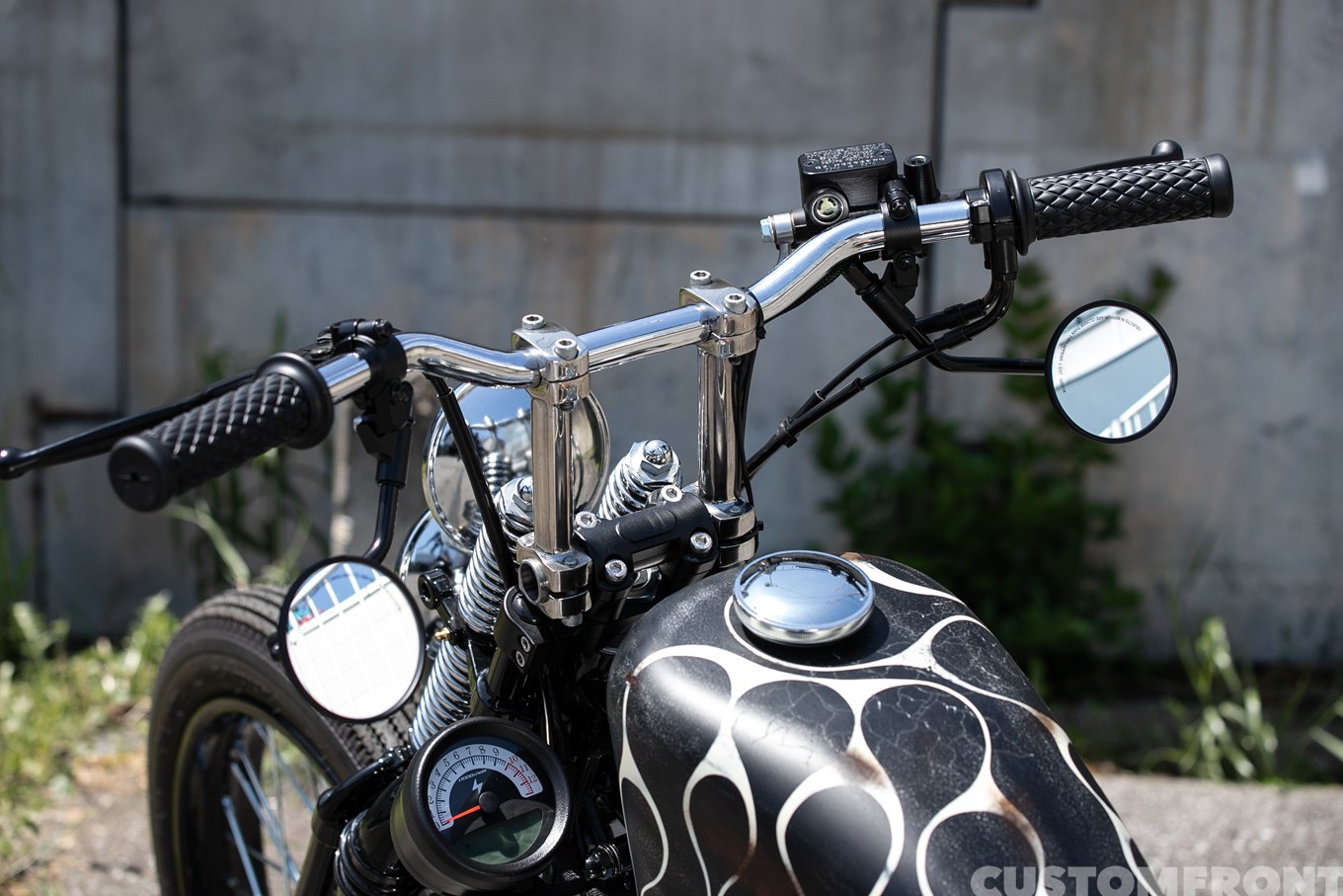 ハンドル周りにはヴィンテージのドッグボーンライザーとスーパーバーを設置。ガスタンクは前側を数ミリ上げてマウントし、シートショップ『スカンク』により張り替えられたシートのマウントも同じく微妙に下げて据え付け。