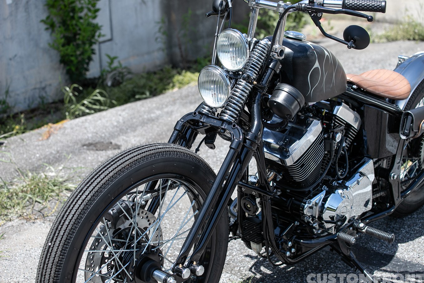 ただでさえカスタムバイクとして完成された感のある車両を、更なる極みへと手を加えたのがこちらの一台だ。ベース車両はソフテイルモデルで、オーナーの希望を咀嚼しつつ、そこに新しい提案をプラスしたものだと作り手の野呂さんは語る。