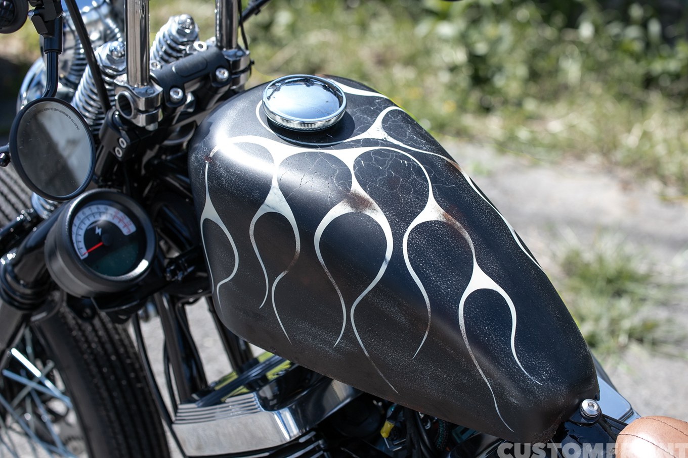 わずかにタンク前側を上げて設置し、全体のシルエットとの均衡を計る。塗装はSTUPID CROWNによるもの。