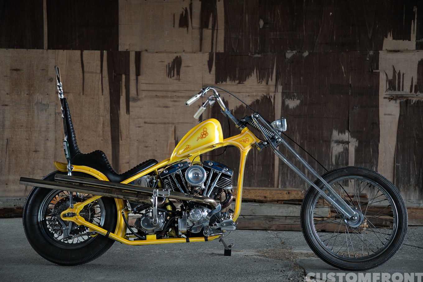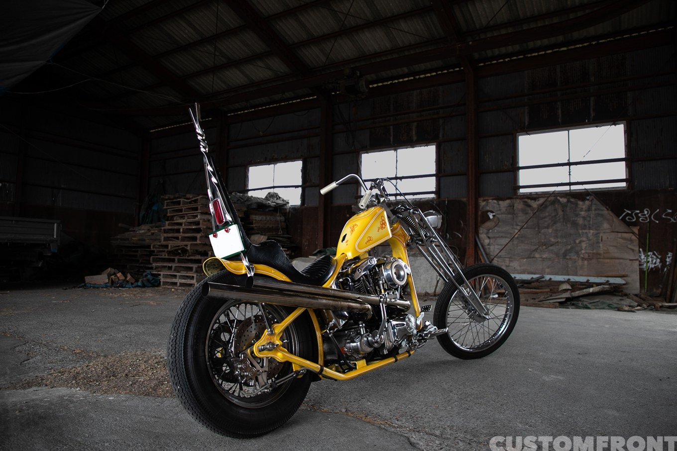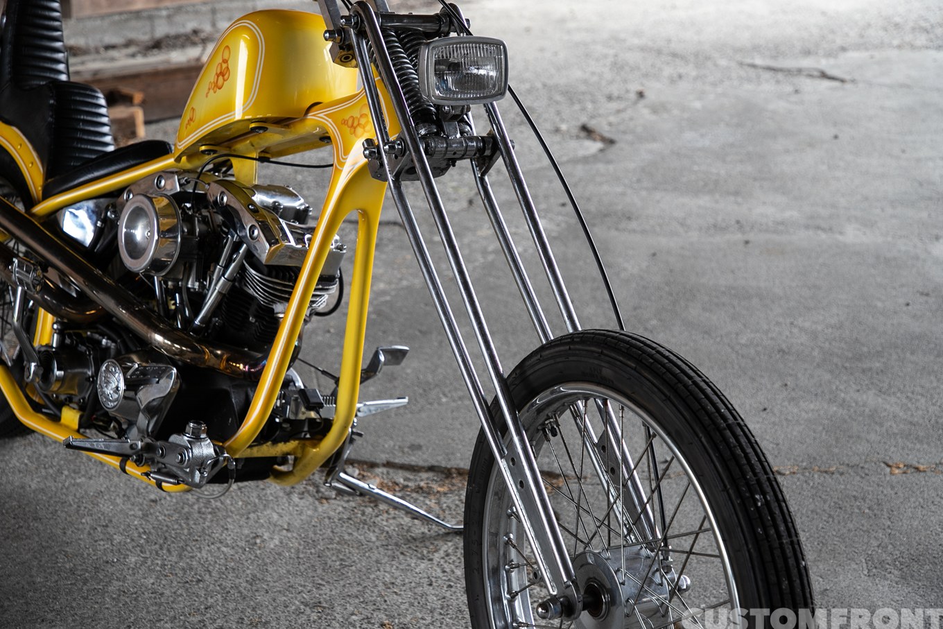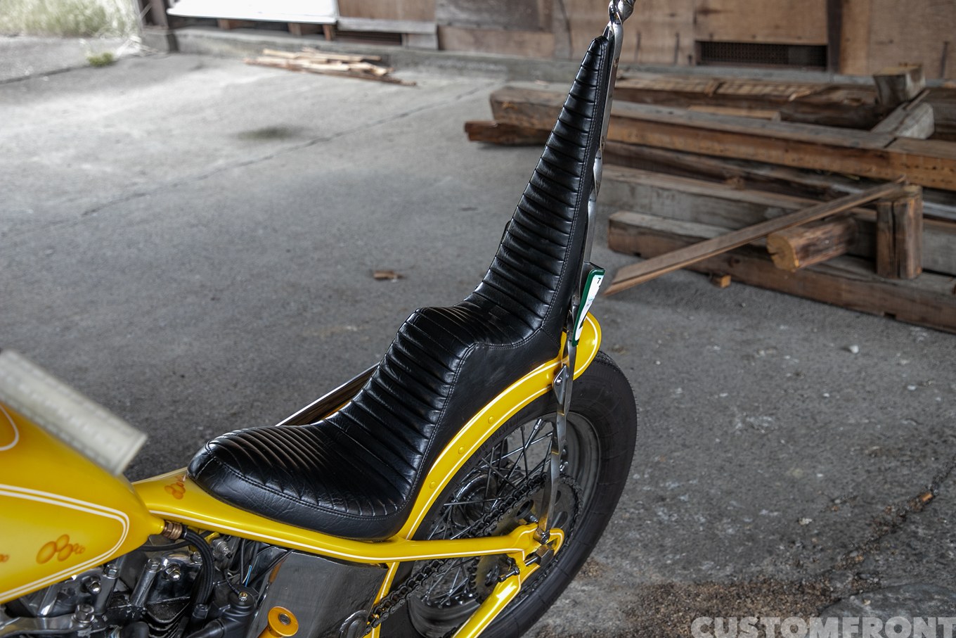 「経緯は、最初このフレームにガーターフォークが付いている状態のをオーナーさんが見てこの感じが良いって。じゃあこれベースでチョッパーいきましょうかって。それでリクエストがネジネジのシーシーバーだったんでそれ合わせでしたね」