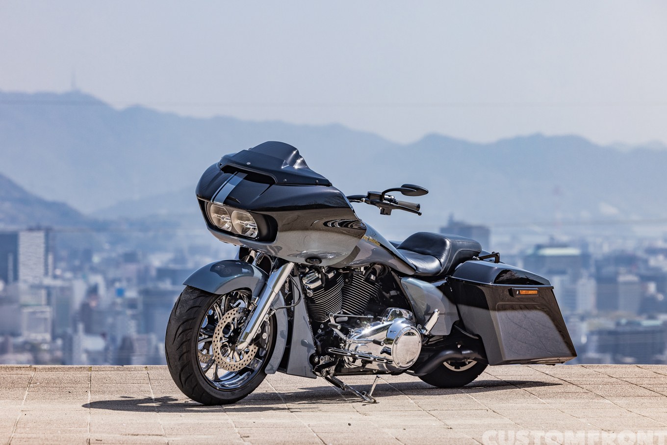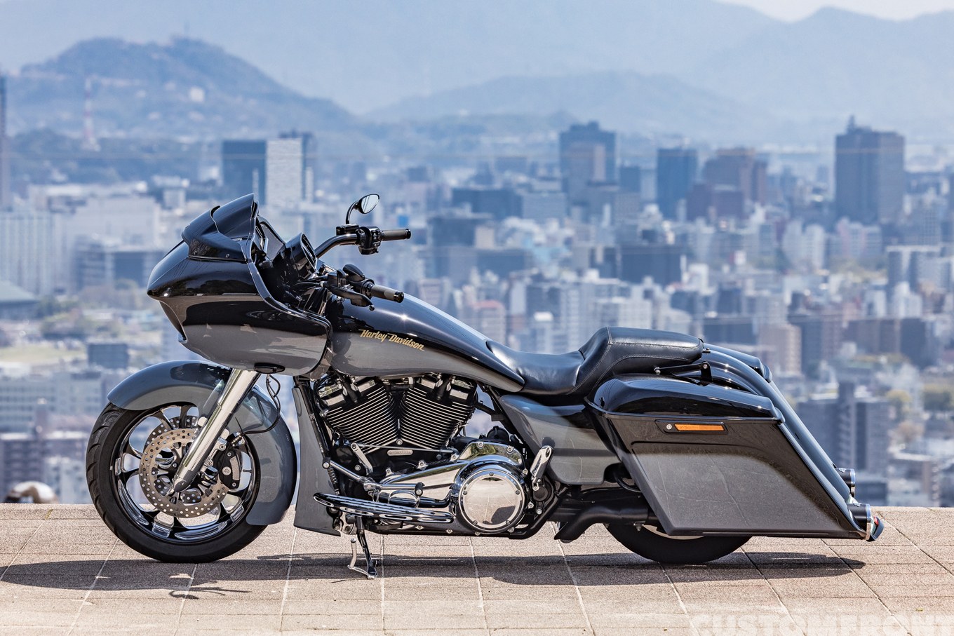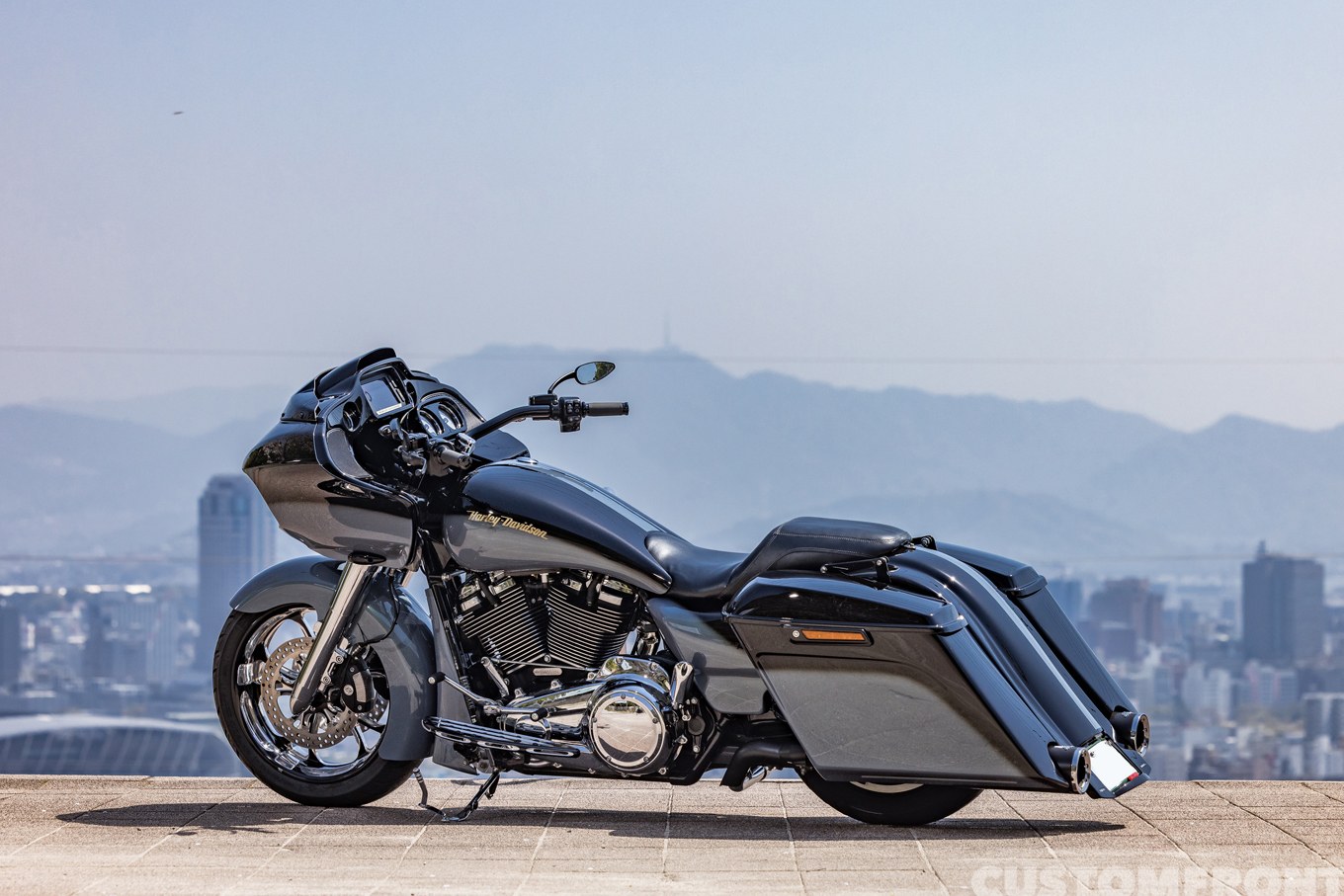 「お客さんのオーダーは『フロントにファットタイヤを履いた、低いスタイルのロードグライド』。今まで26インチとかの大口径で長いバガーは作ってきましたが、ファットタイヤのカスタムは初めてでした」。そう話すのは店主である立岡さんだ。