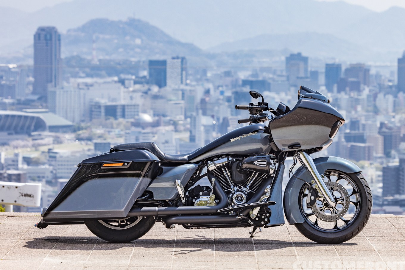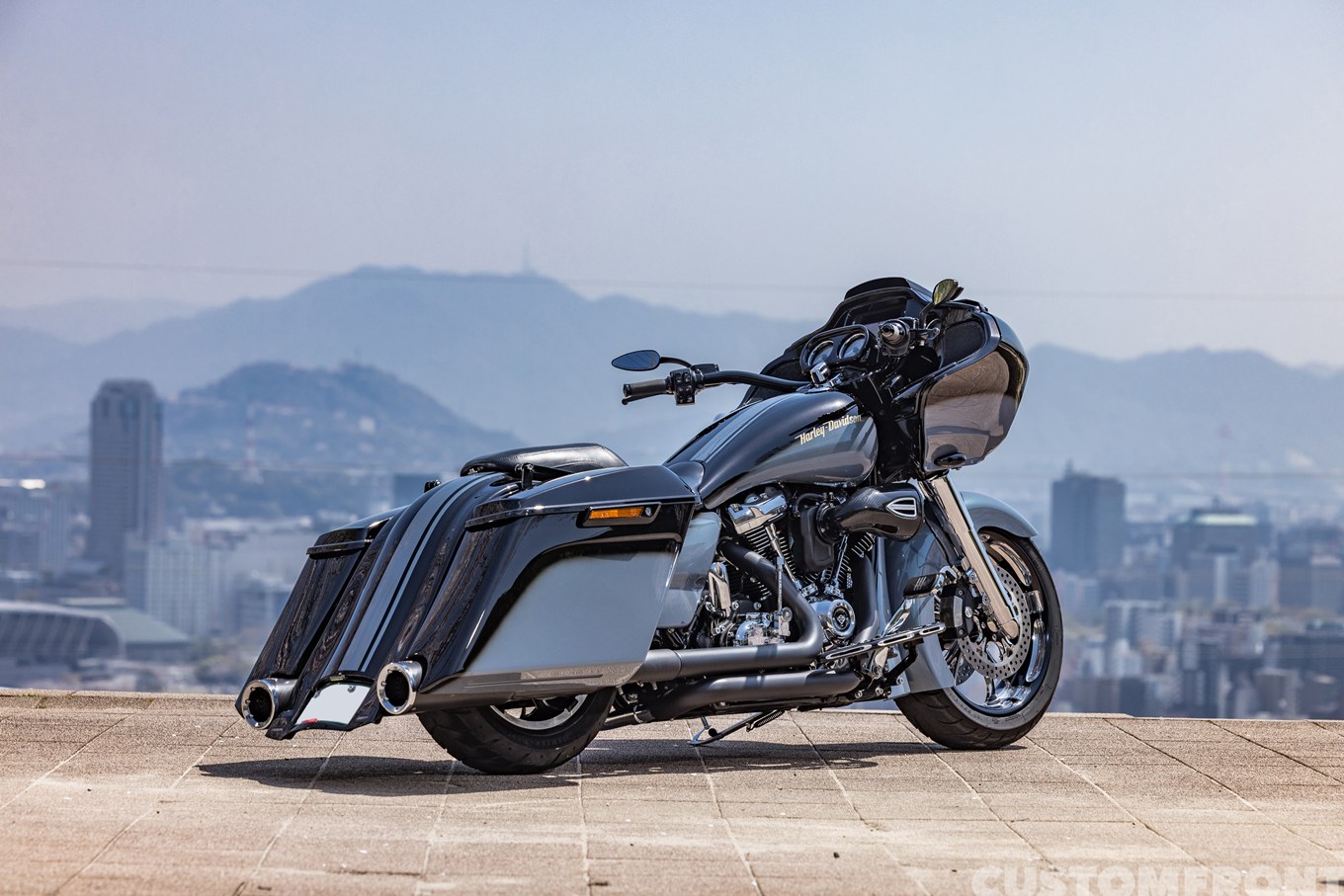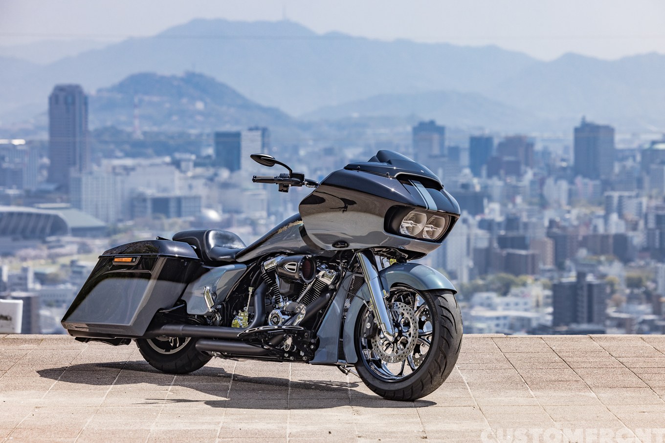 「お客さんのオーダーは『フロントにファットタイヤを履いた、低いスタイルのロードグライド』。今まで26インチとかの大口径で長いバガーは作ってきましたが、ファットタイヤのカスタムは初めてでした」。そう話すのは店主である立岡さんだ。