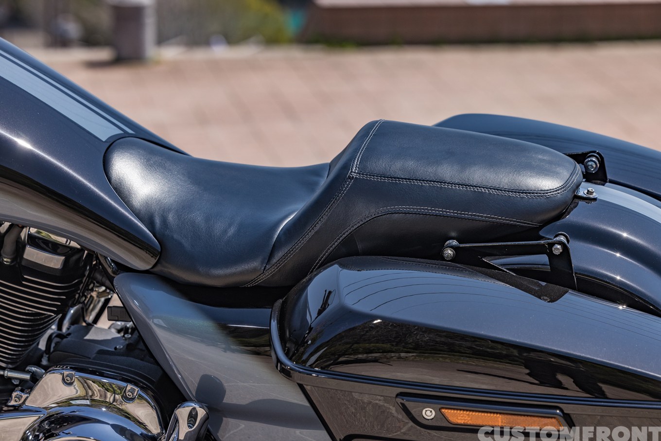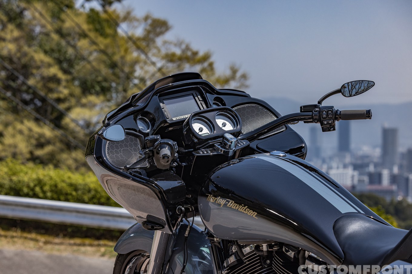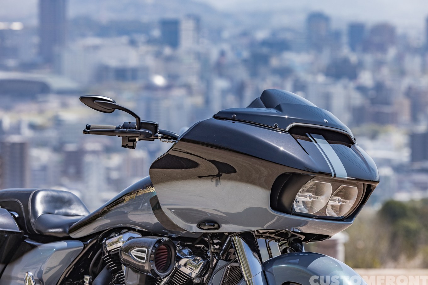 更にサスペンションは前後共にローダウン。それらに合わせ、ロードグライドの文字通り『顔』であるデュアルヘッドライトを備えたフェアリングはマウント位置を2インチほどダウン。