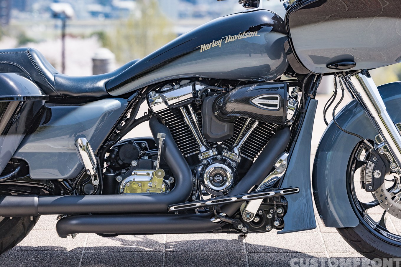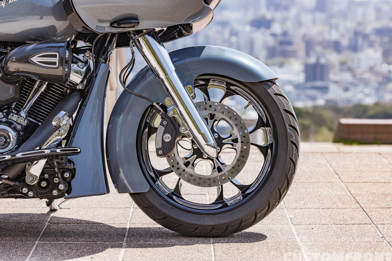 アメリカHHI製のファットホイールキットを使用し、履き替えたそのサイズは180 / 22R18。太めのタイヤにより、重厚なロードグライドは更に重量感を増している印象だ。