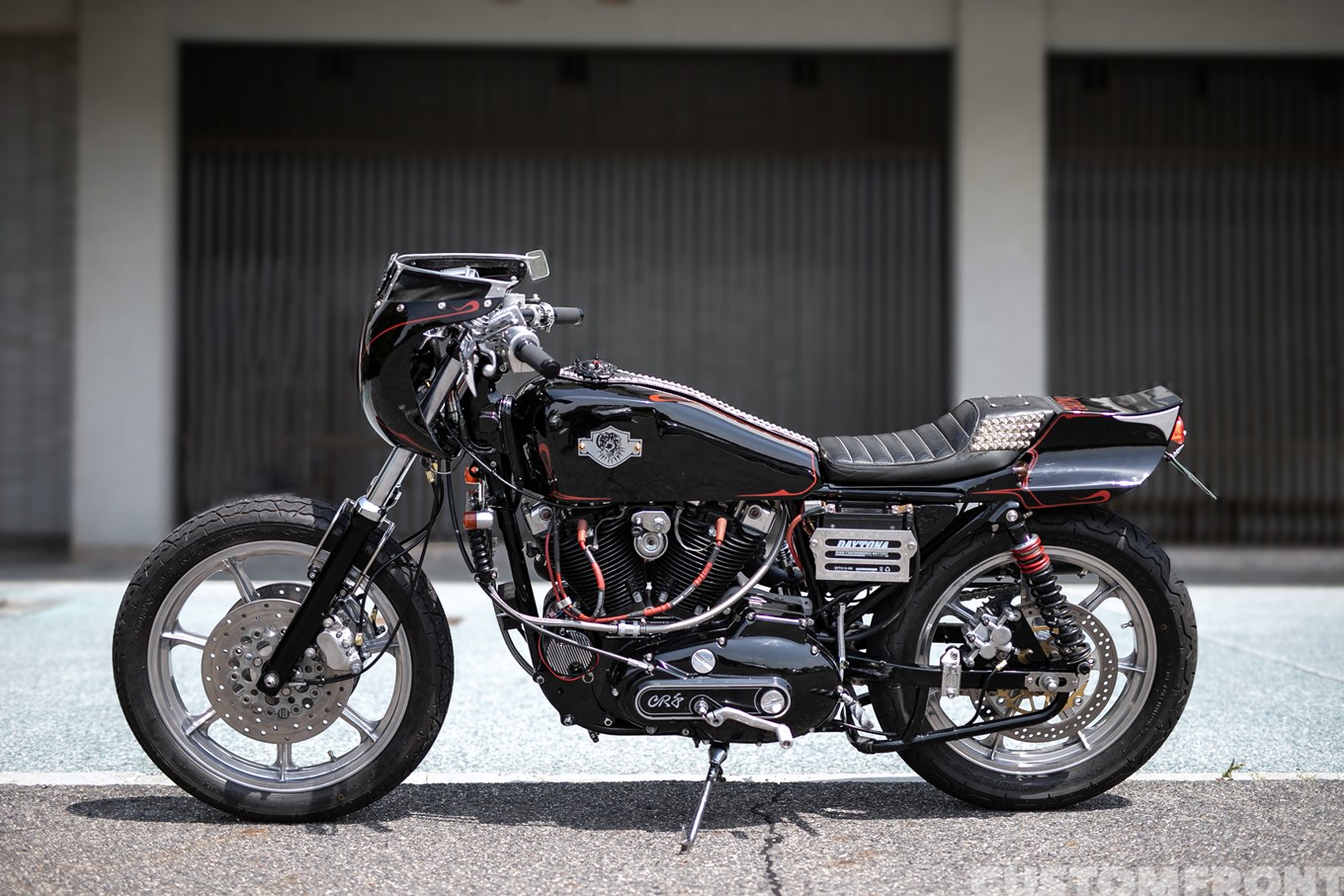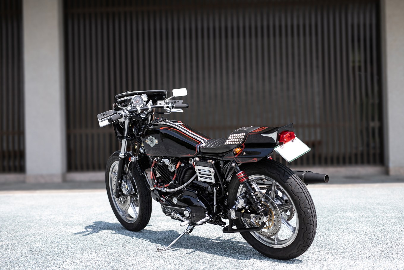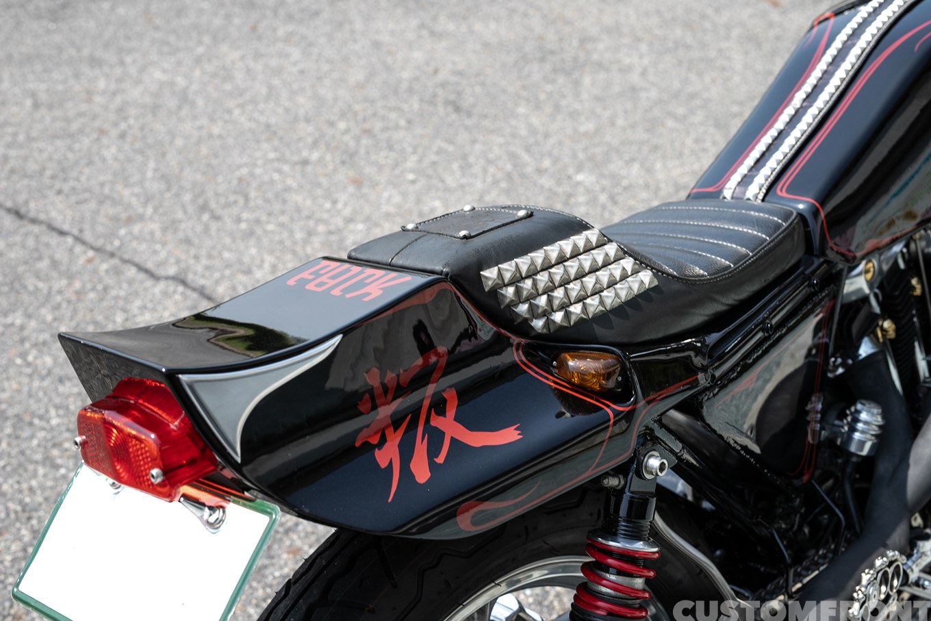 程よくリアエンドを反り上げた自称『エビテール』は鉄板で成形し、一方、フロントには減衰調整機能付きのXL1200S用フォークを装着。勿論そのままではXLCRに付かないため、イチからステムシャフトが作り直されている。