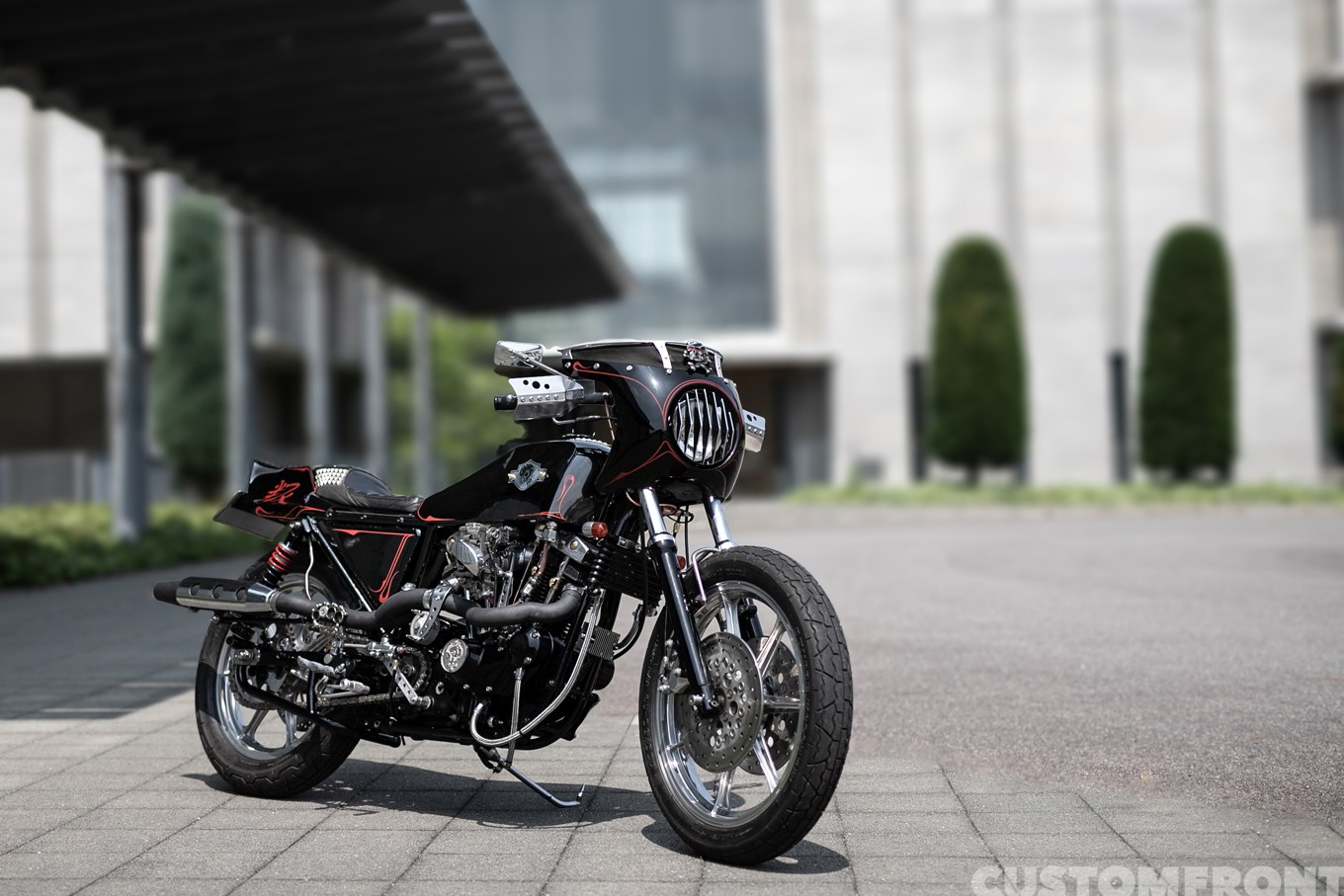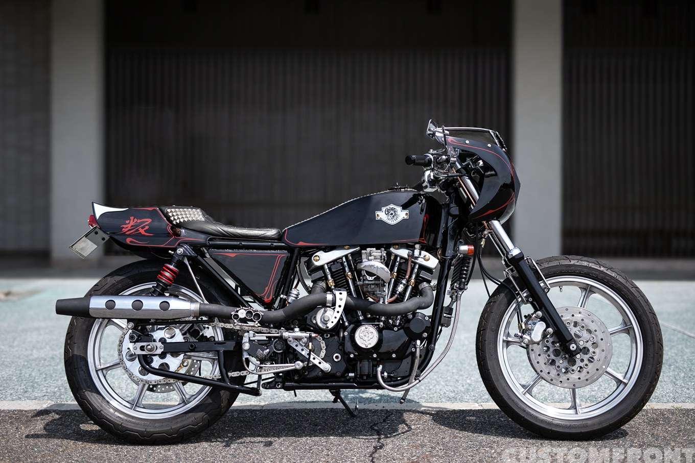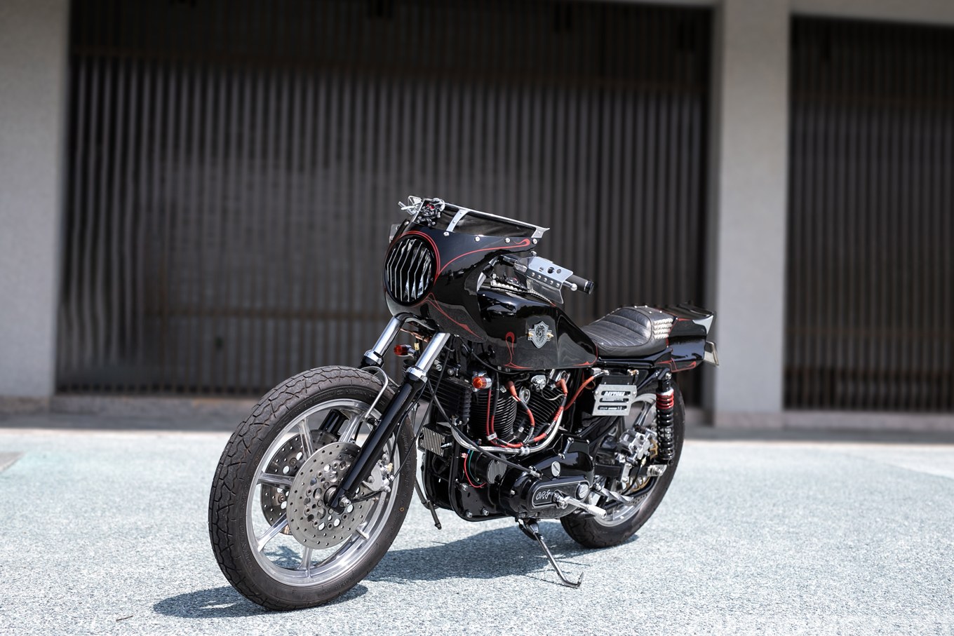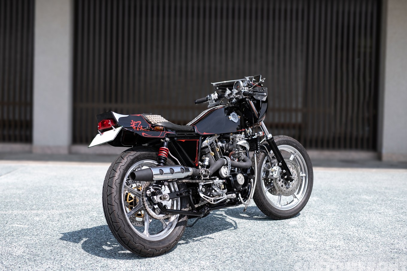 程よくリアエンドを反り上げた自称『エビテール』は鉄板で成形し、一方、フロントには減衰調整機能付きのXL1200S用フォークを装着。勿論そのままではXLCRに付かないため、イチからステムシャフトが作り直されている。