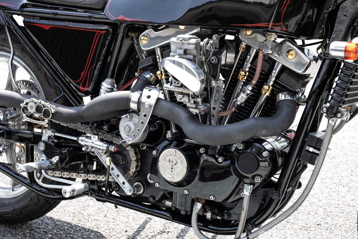 オーバーホール後にFCRキャブをセット。外見を彩る各ステーなどの混成なテイストが同店の持ち味となる。