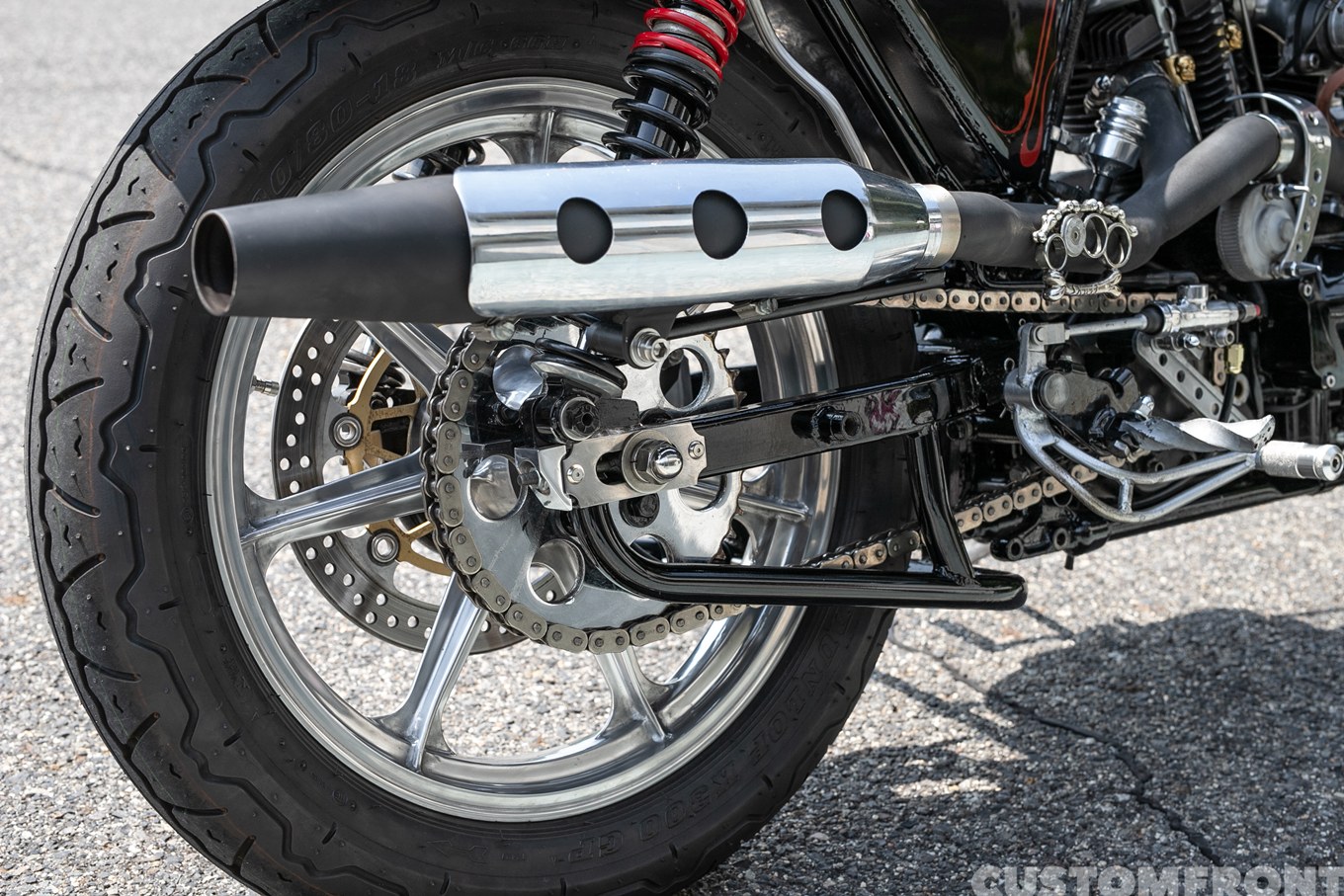 また、スイングアームは鉄でワンオフし、前後ホイールは純正モーリスをポリッシュして使用するが、リアブレーキにカワサキZX-10用を流用するなど堅実な走行性も担保。FCRキャブや各所の国産パーツでしっかりと走りに重点が置かれた後に、自称40年生のカスタムが見る者のみぞ落ちをえぐってくる。