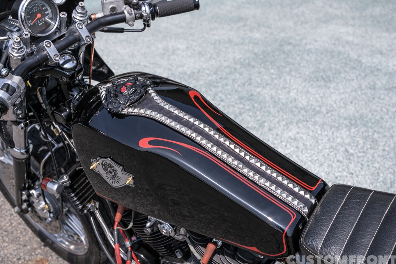 タンクもXLCR純正を用いるが中央を装飾。’60年代のマン島レーサーを情景しつつオーナメントに角鋲を付帯。