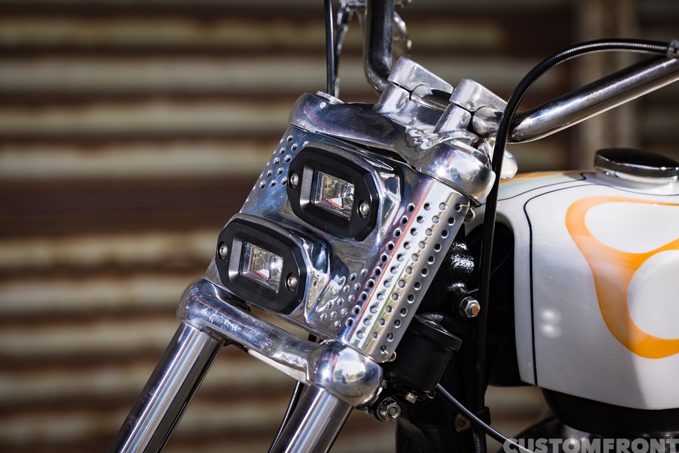 筆頭はその“顔面”たるヘッドライト周り。レーサーのゼッケンプレートをイメージした、ナセル然としたパートにライトを配置。車体の随所に施されたドリルドをここにも配し、レーサー感を加速させている。
