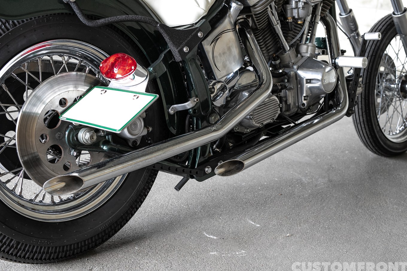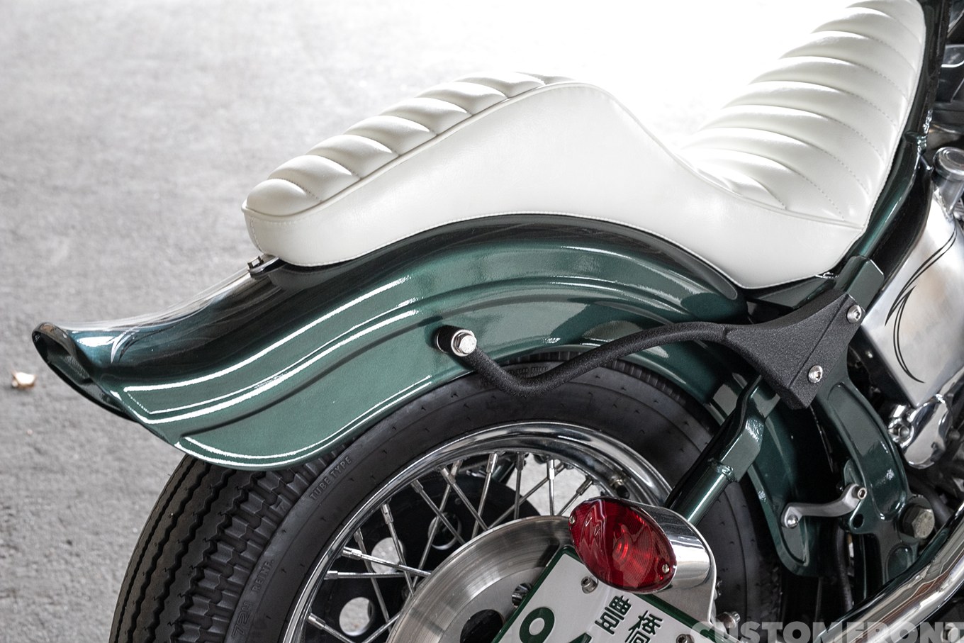 このチョッパーは高度な大人の風采を漂わすべくボブフェンダーにこだわり、フェンダーをカットせずスイングアーム下側まで活かすことでリジッドフレームのような錯覚を覚えさせているのだ。
