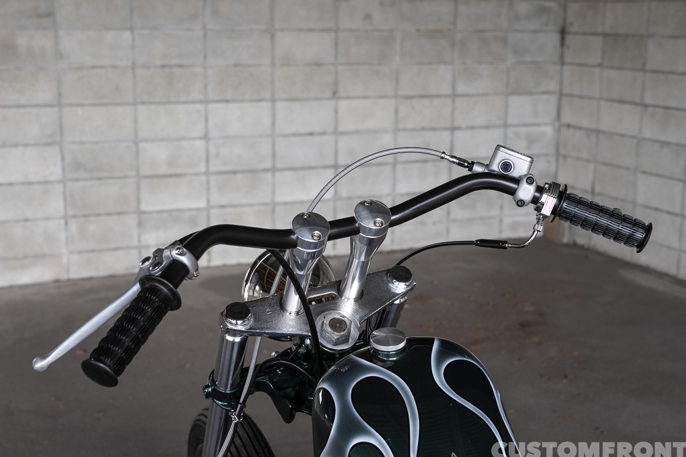 ショベルの三つ又にロングライザーをセット。ハンドル周りのスイッチ類を排除しすっきりしたレイアウトに。