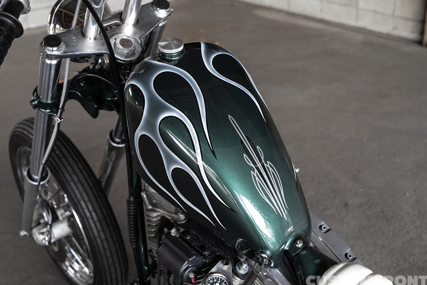 幅詰めをしていないタンクにダークグリーンマイカの塗装をビルダー自ら行い、グリム氏によるピンストを施す。