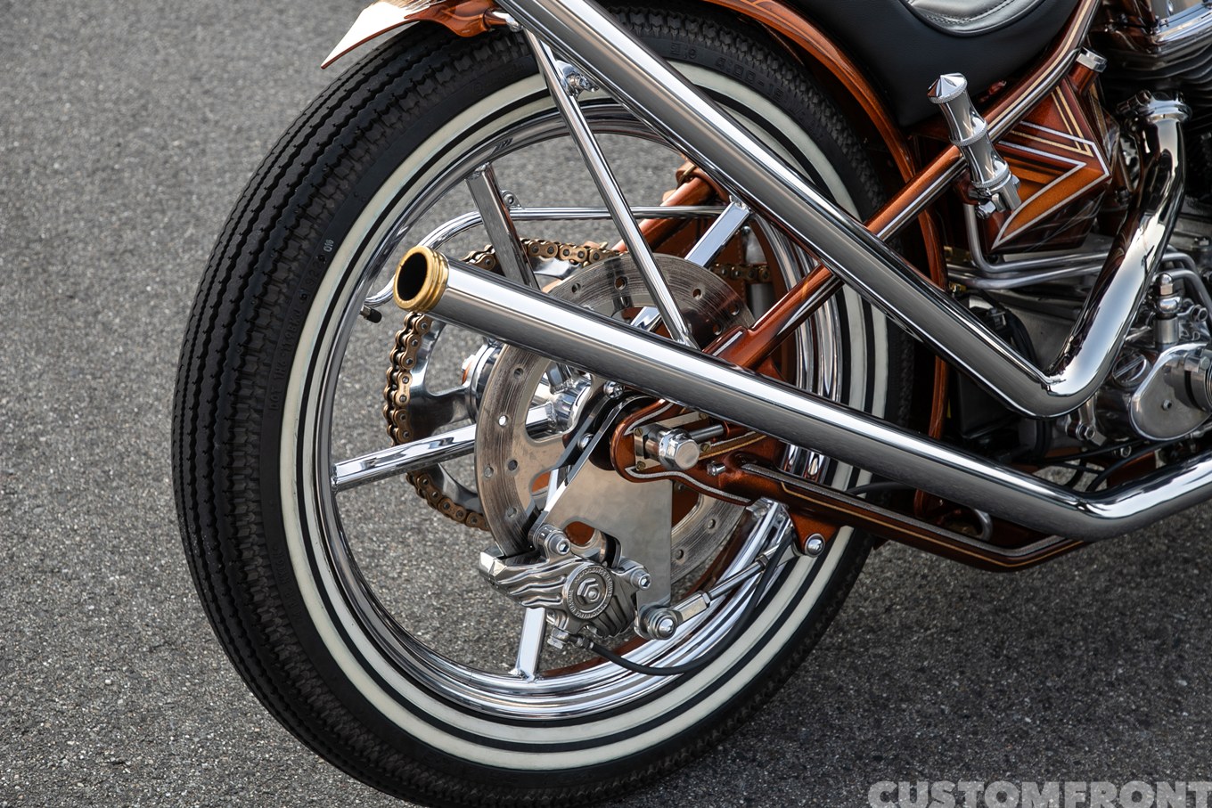 アップスイープのポーカーパイプはあえてフロントとリアの角度を変えてマウント。エンドに真鍮リングが付く。