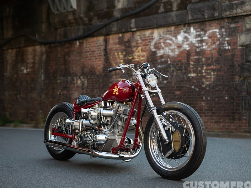 1960年代後期のカフェレーサーを起案としたツインキャブのショベルヘッド。スイングアームフレームで練り上げたスタイルの、観衆への一発目の衝撃はもちろんエンジンだ。