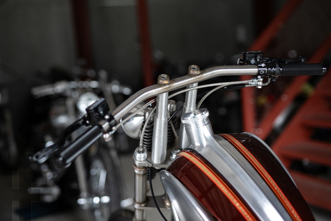 1インチ径のライザー一体型ハンドルバー。アルミとステンレスの異素材を組み合わせることで独自の表情を形成。純正ラバーマウントから付属のソリッドマウントに変更して装着。