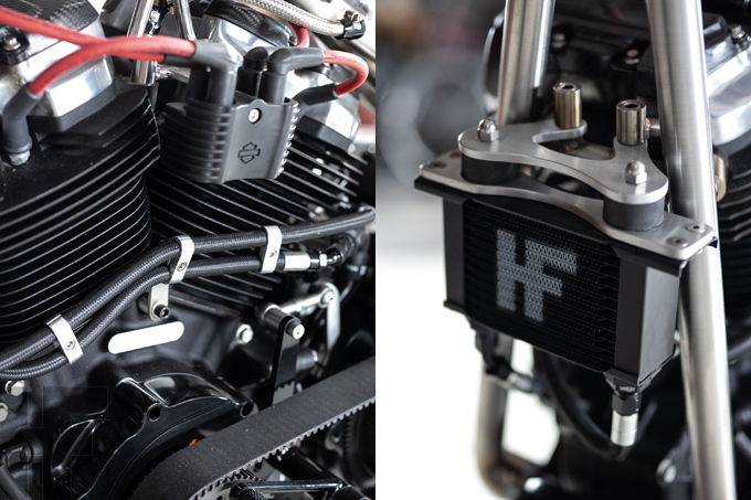 レーシングマインドが宿るテクニカルパーツ。国内の劣悪な交通事情を強力にサポート。左側オイルラインの美しい取り回しに作り手の感性が如実に現れている。M8モデルに対応。