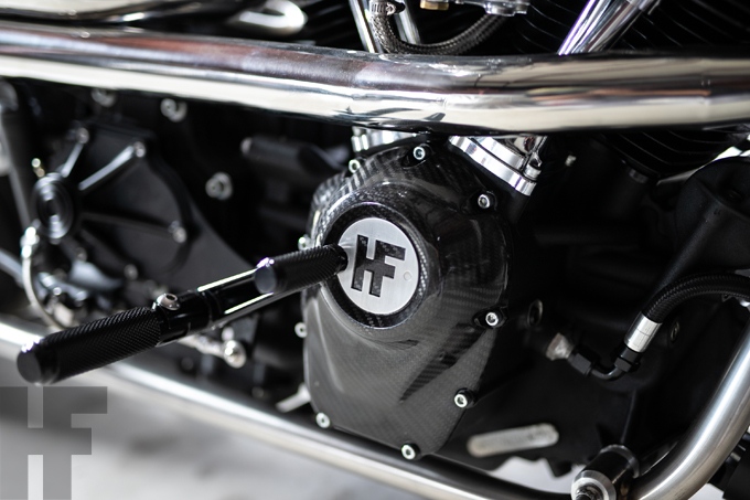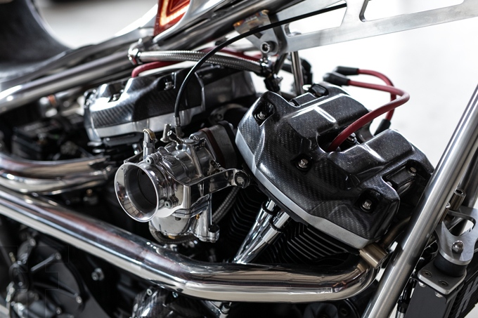 ヴィンテージモーターもフェイバリットながらミルウォーキーエイトに未来を見出し、金属パーツ以外に、カーボン製ロッカーボックスやカムカバー、フェンダーなどを随時開発。