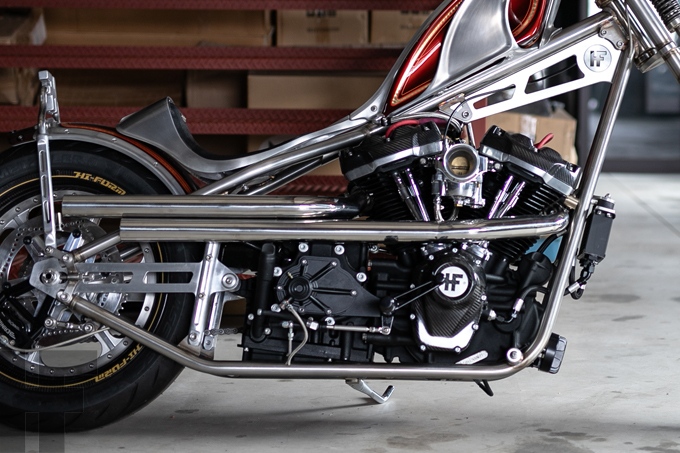 ホットロッドやインディ500のレーシングシャーシ製作に深く携わってきた彼が、鉄と比べて加工難度の高いクロモリ鋼やステンレス材を好んで使用するのはそのためである。