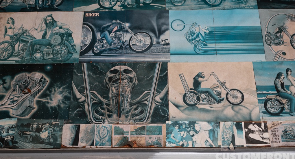 まず、パーツ屋さんがない。それでバイク乗りの友達が何人かいる、仙台でもね。でそいつらと走るようになってある日一人が雑誌、これだよ、この『イージーライダース』の切り出しだったり『インザウインド』だったり、なんか薄っぺらなアメリカの本あったじゃん。あれを見て衝撃を受けたね。そっからだよ俺は。仕事しながら自分でいじりまわすわけだ。