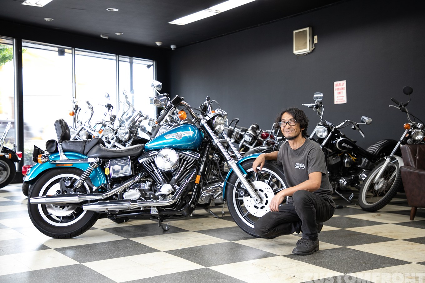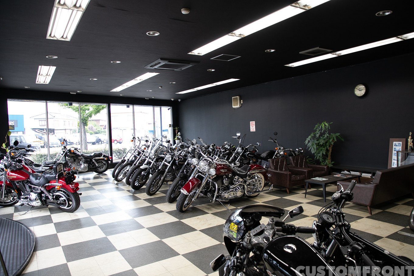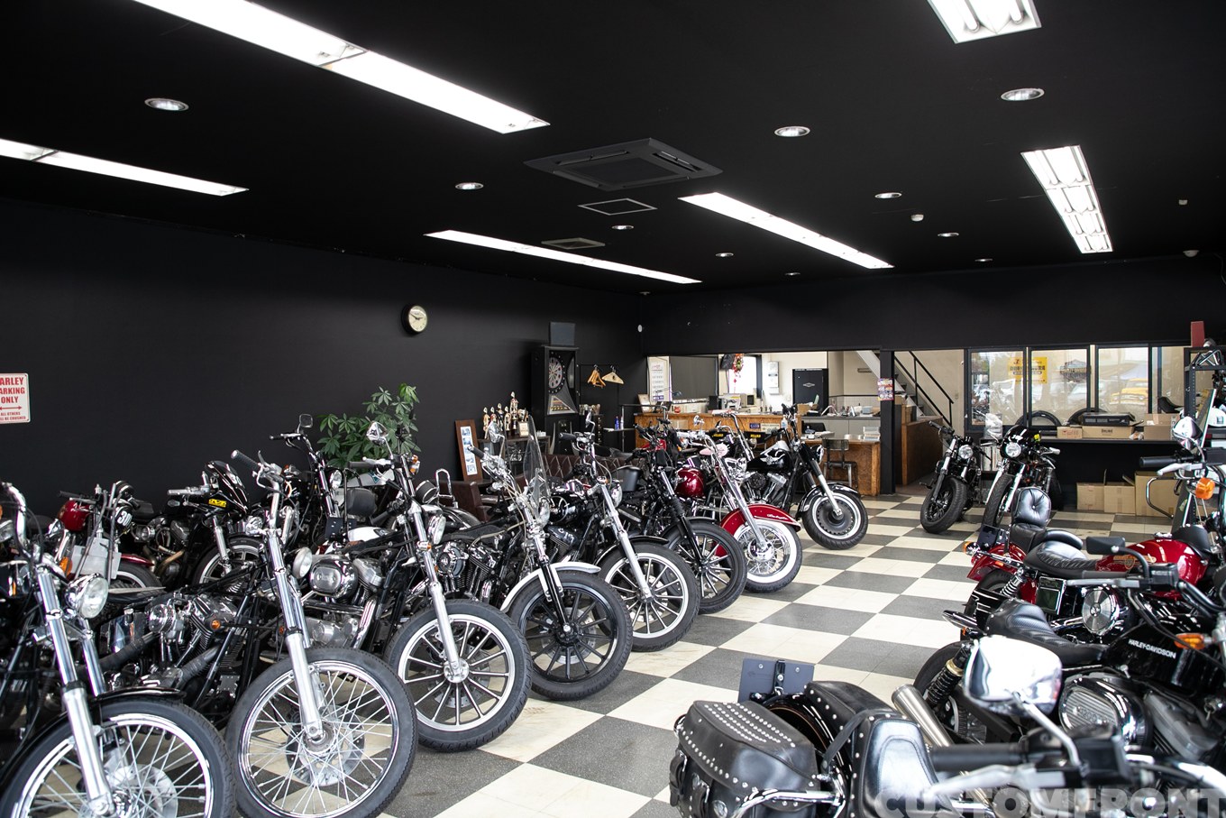 ハーレーのエボリューションを枢軸にして、ショベルヘッドから現行M8モデルまでのカスタムや修理といったメニューに順応し、それと並行して程度の高い車両販売も展開。現在はストックスタイルのエボリューションを多く取り揃えている。