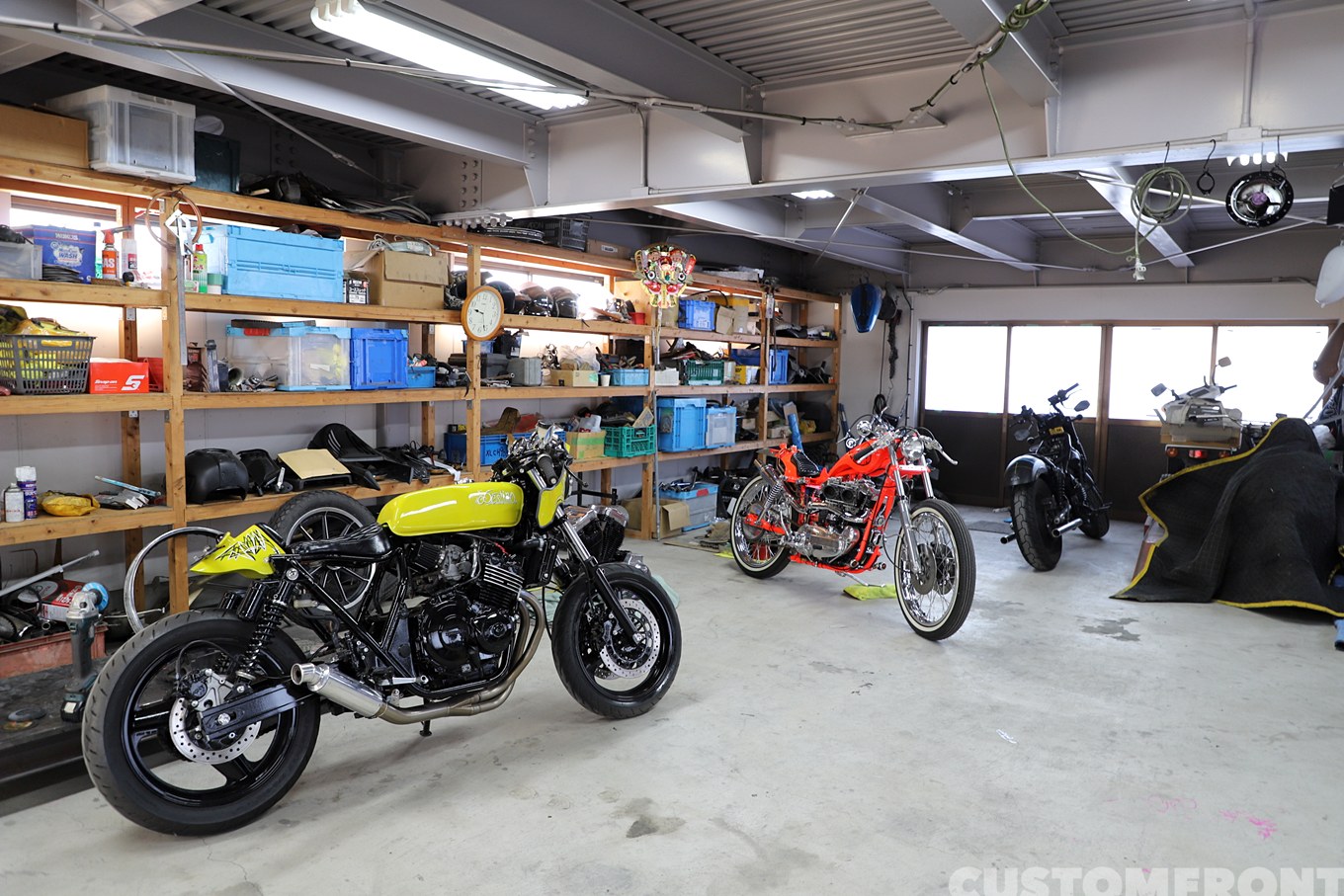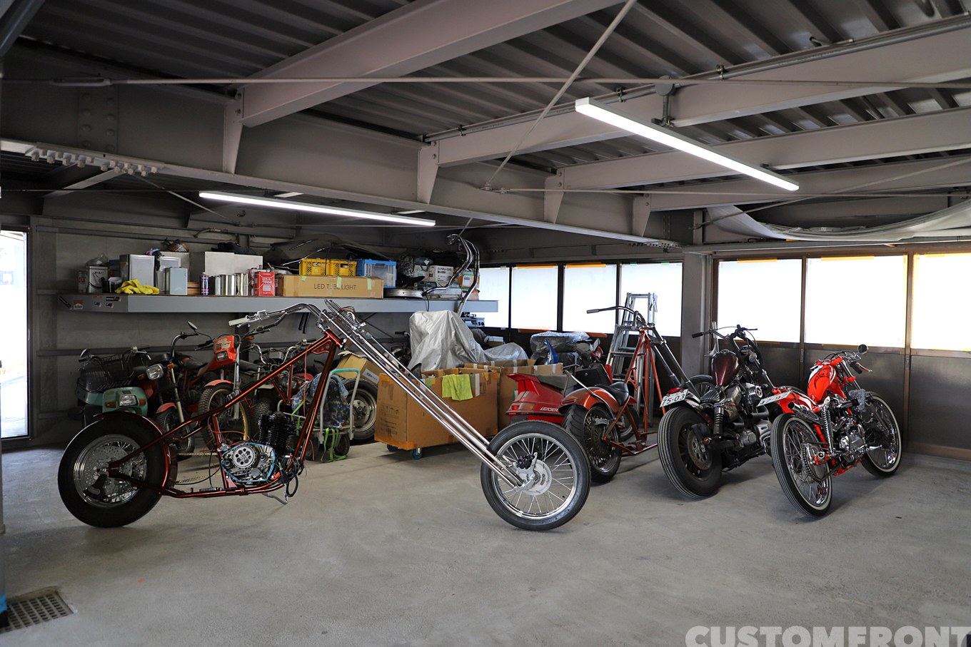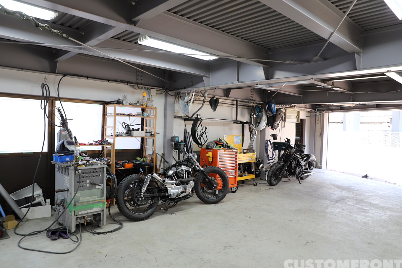 移転して間もない店内にはカスタム待ちの車両が待機。派手なチョッパーを扱う反面、根底には大型機械のメンテナンス職で培った1000分の1単位の精緻な物の考え方などが宿る。